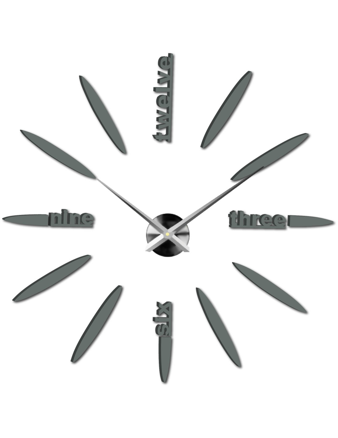 Designer-3D-Uhr mit ovalen Markierungen und räumlichen Inschriften auf den Hauptpunkten des Zifferblatts.
