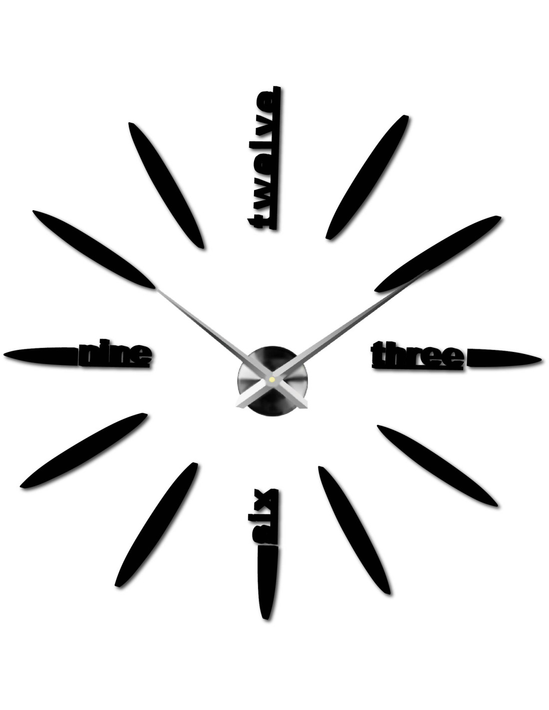 Moderne 3D-Wanduhr mit Aufschriften statt Zahlen und minimalistischem Design.