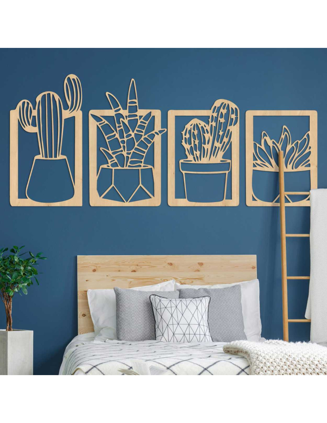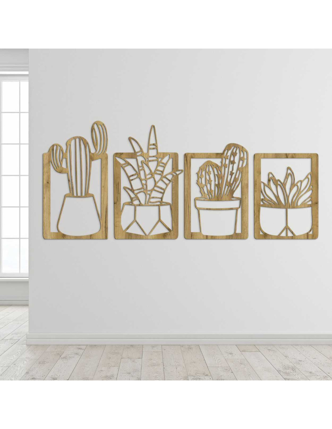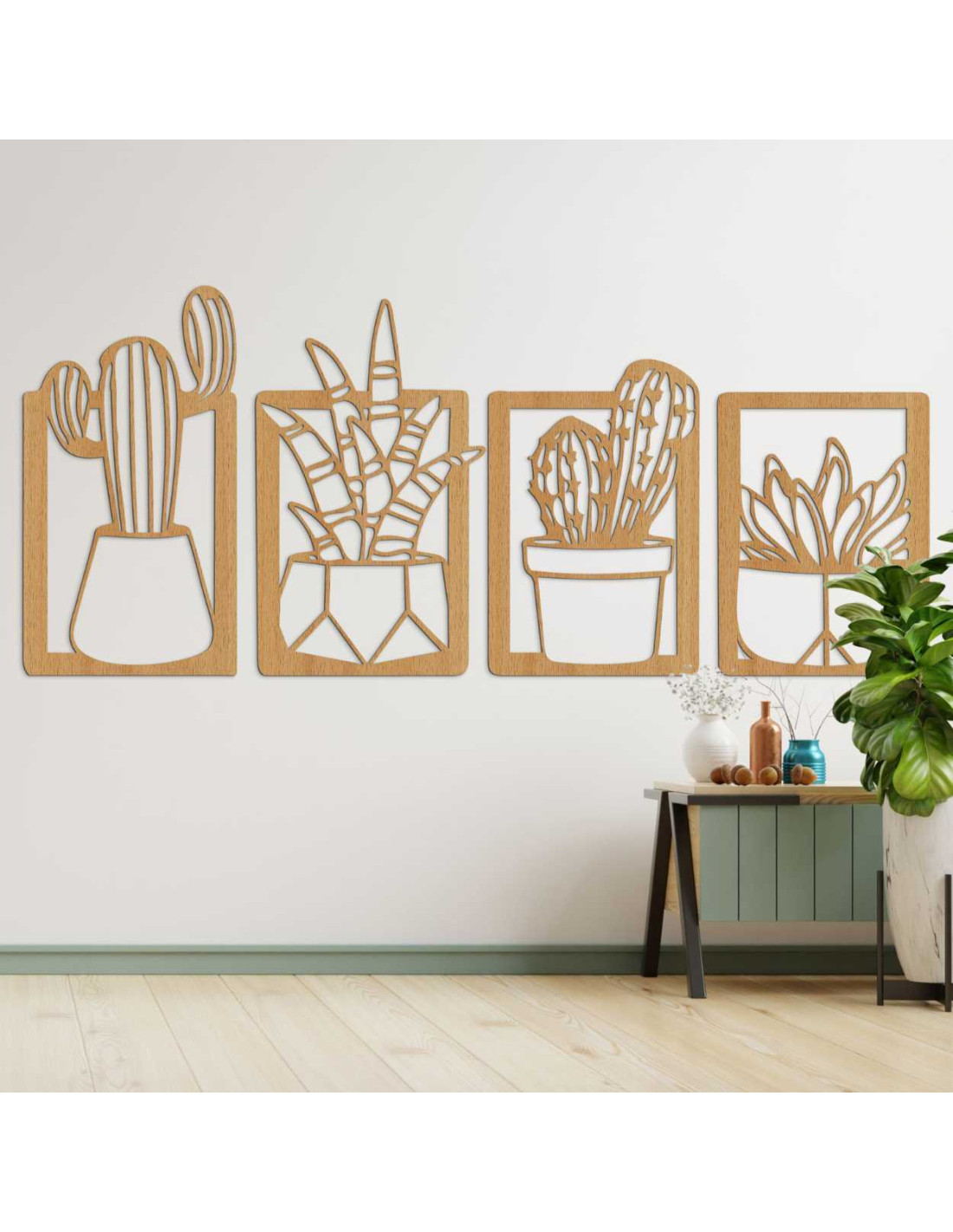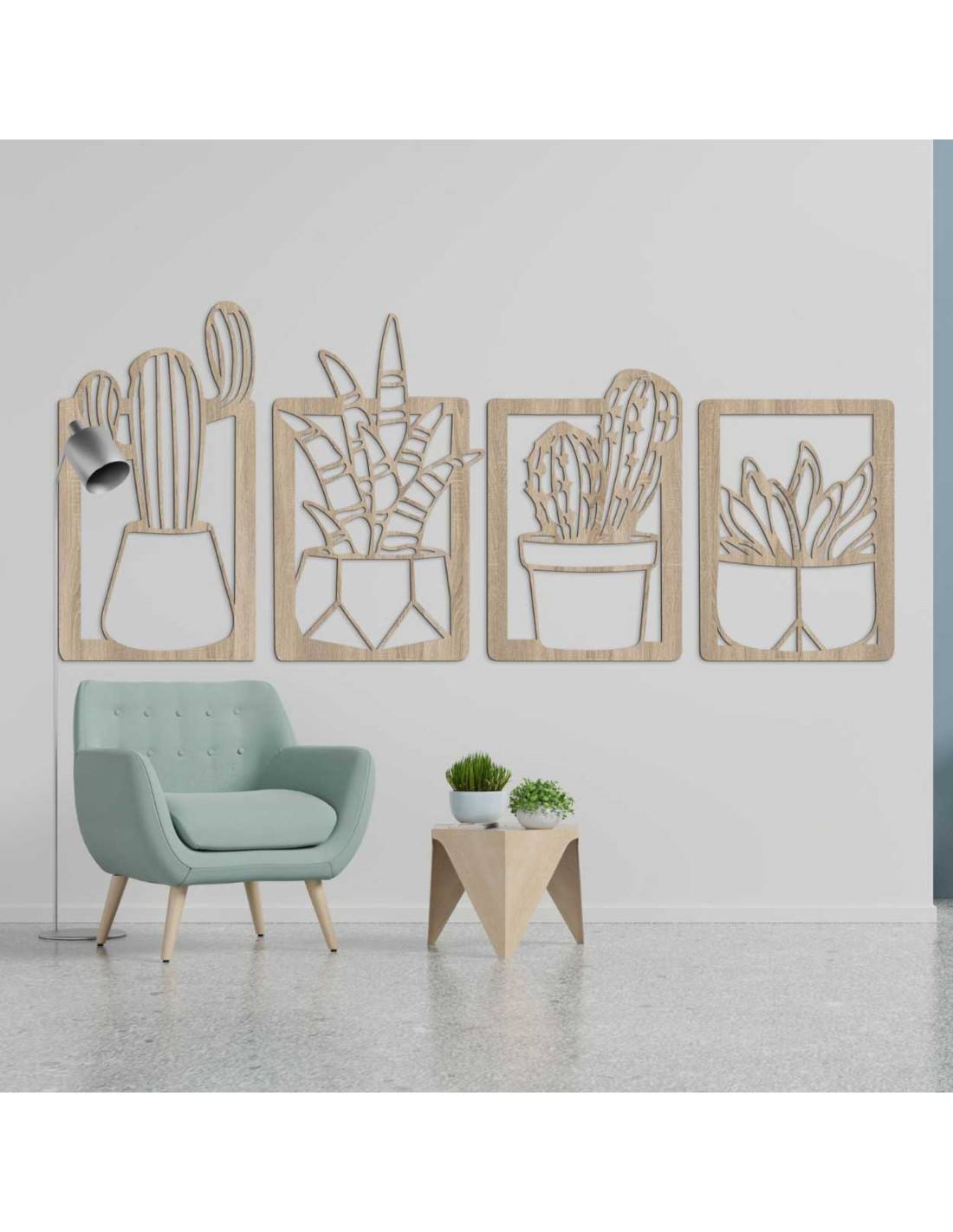 Wanddekoration aus Holz mit vier Motiven von Sukkulenten und Kakteen in Töpfen
