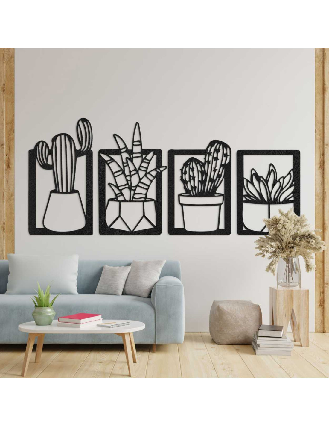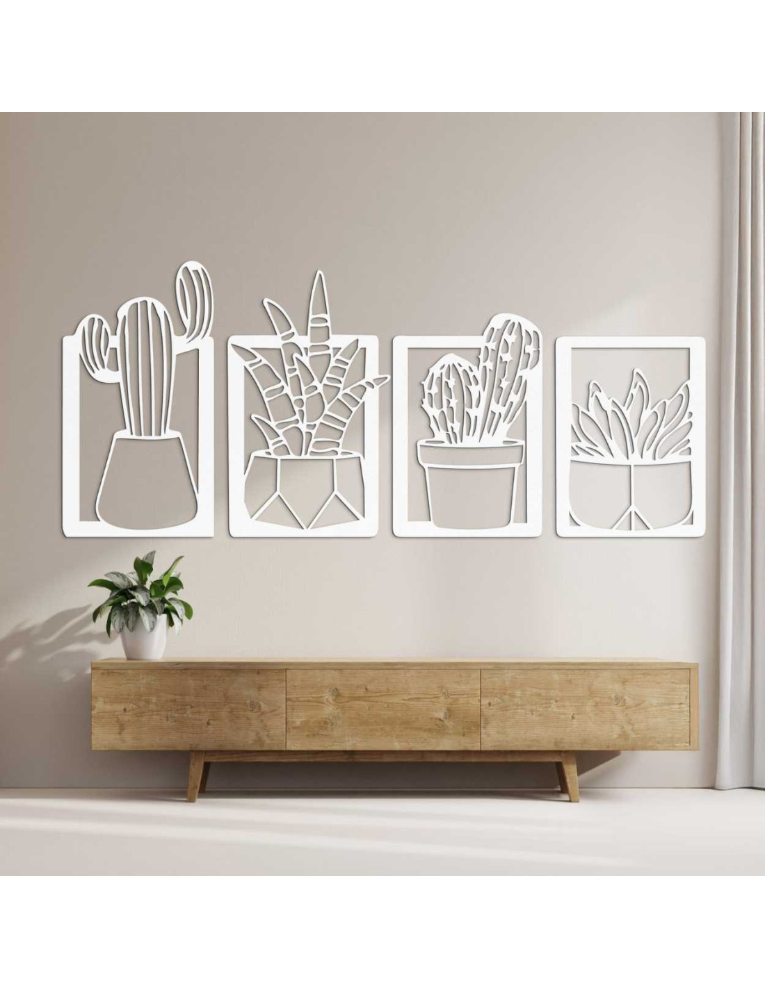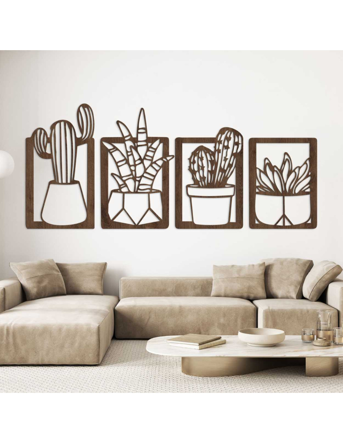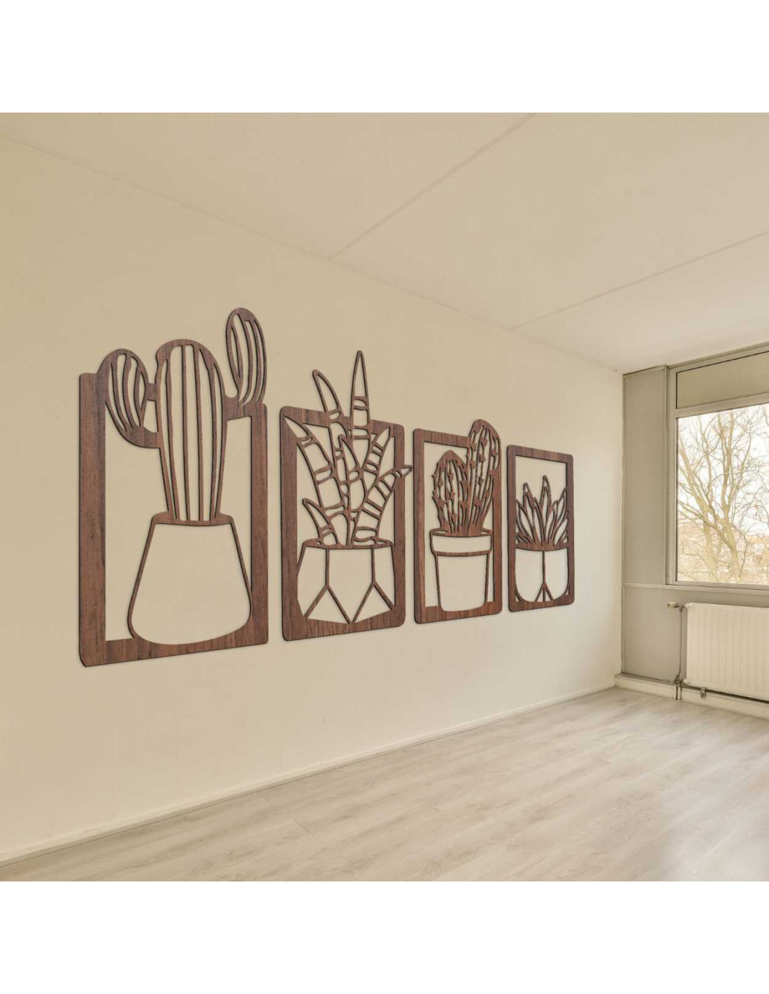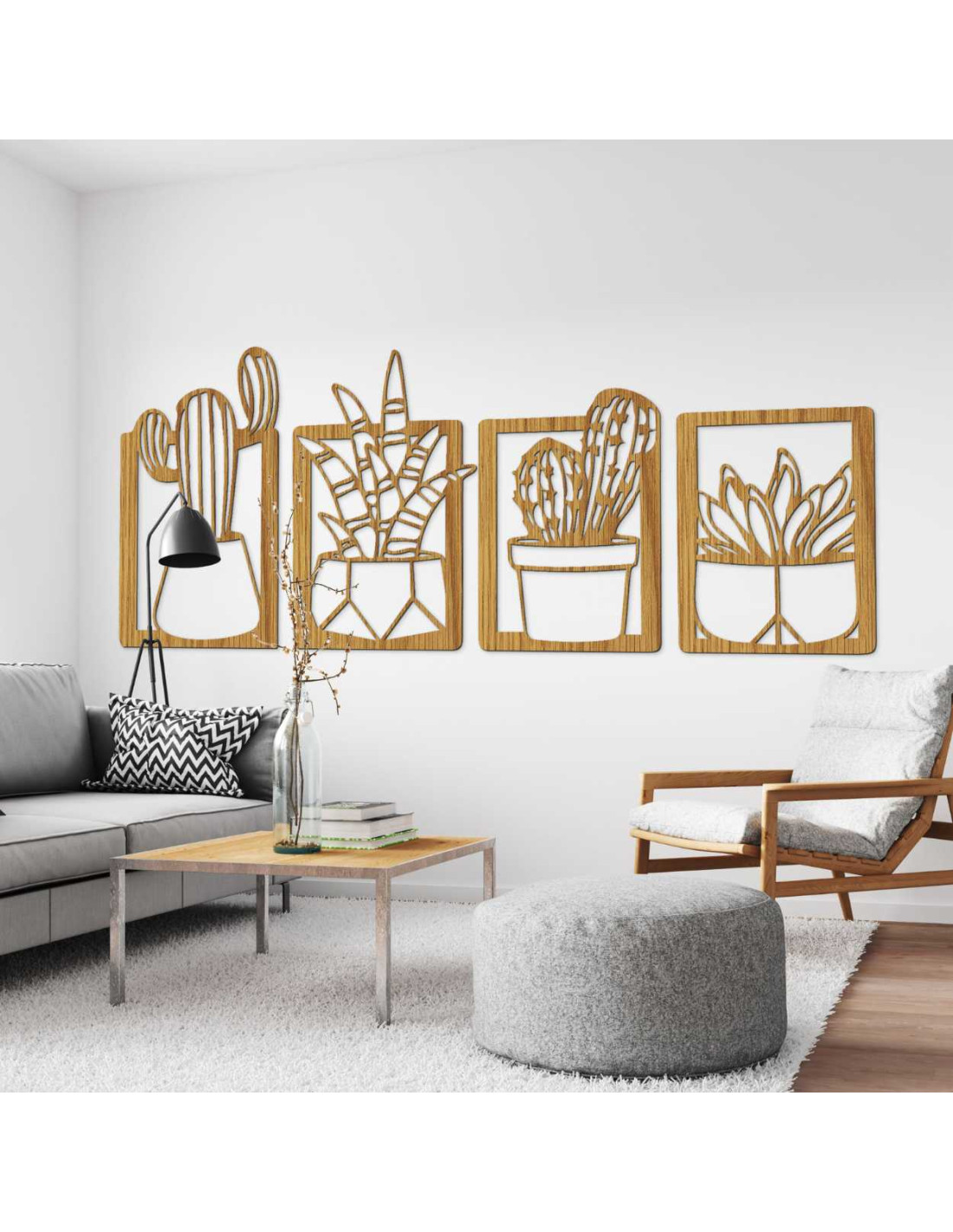Wanddekoration aus Holz mit vier Motiven von Sukkulenten und Kakteen in Töpfen