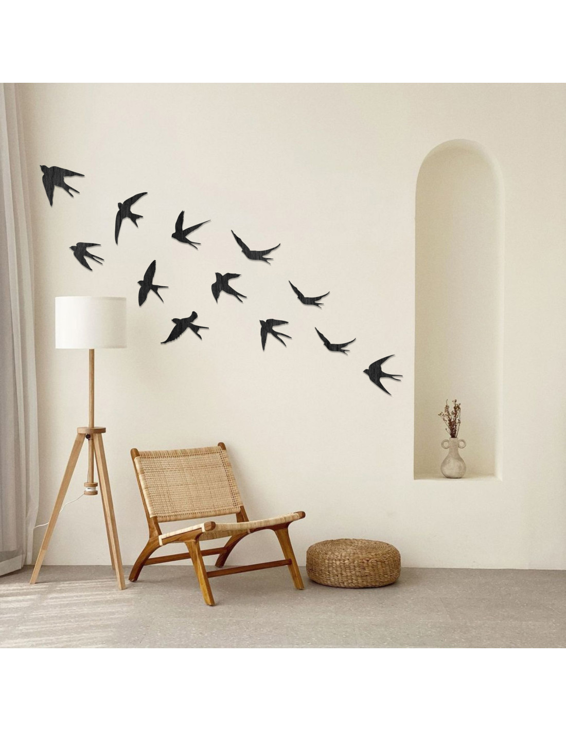 Diese hölzernen Schwalben symbolisieren Freiheit , Bewegung und Eleganz. Sie heben sich von einer dunklen Wand ab und vermitteln ein Gefühl des Fliegens, das dem Raum Dynamik verleiht. Sie eignen sich sowohl für moderne als auch für rustikale Innenräume.