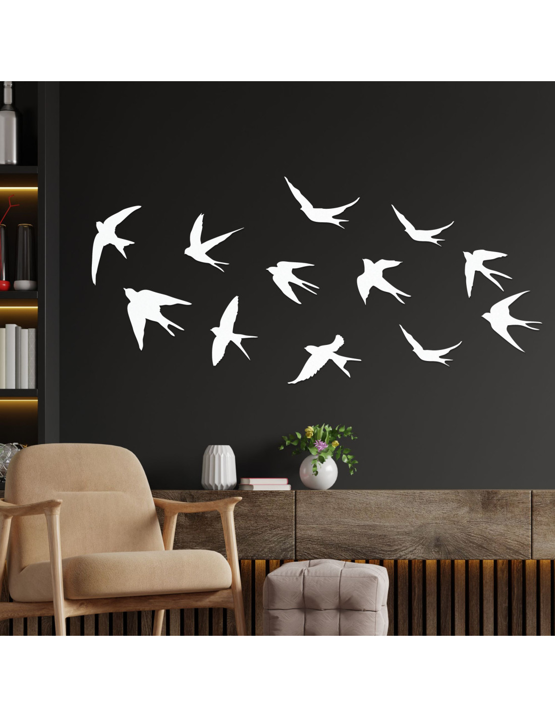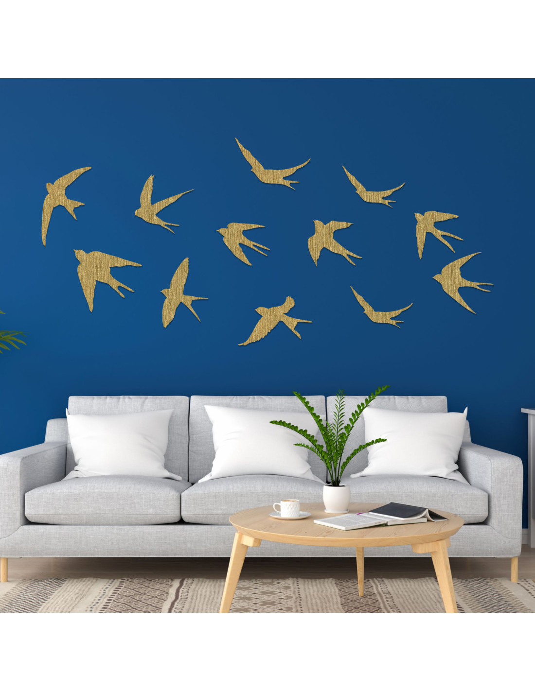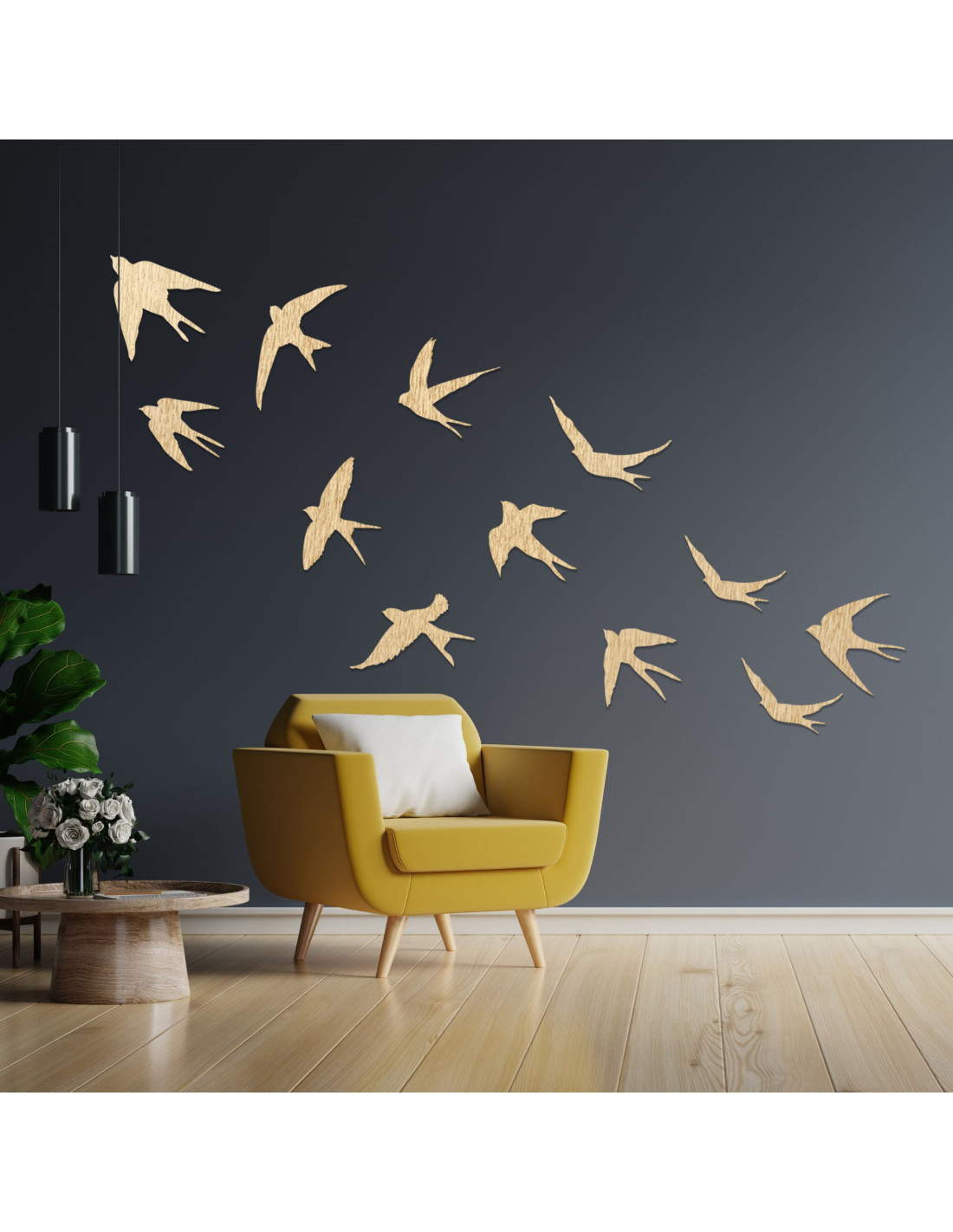 Dieses Design besticht durch minimalistische Holzdekorationen in Form von Schwalben im Sommer. Die hellen Holzsilhouetten kontrastieren mit dem dunklen Hintergrund und erzeugen einen eleganten Effekt. Es wirkt dynamisch und verleiht dem Raum Leichtigkeit.