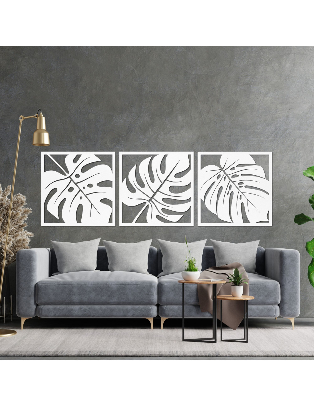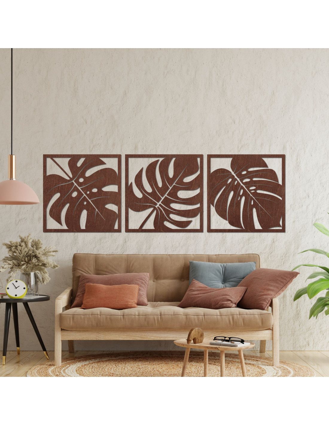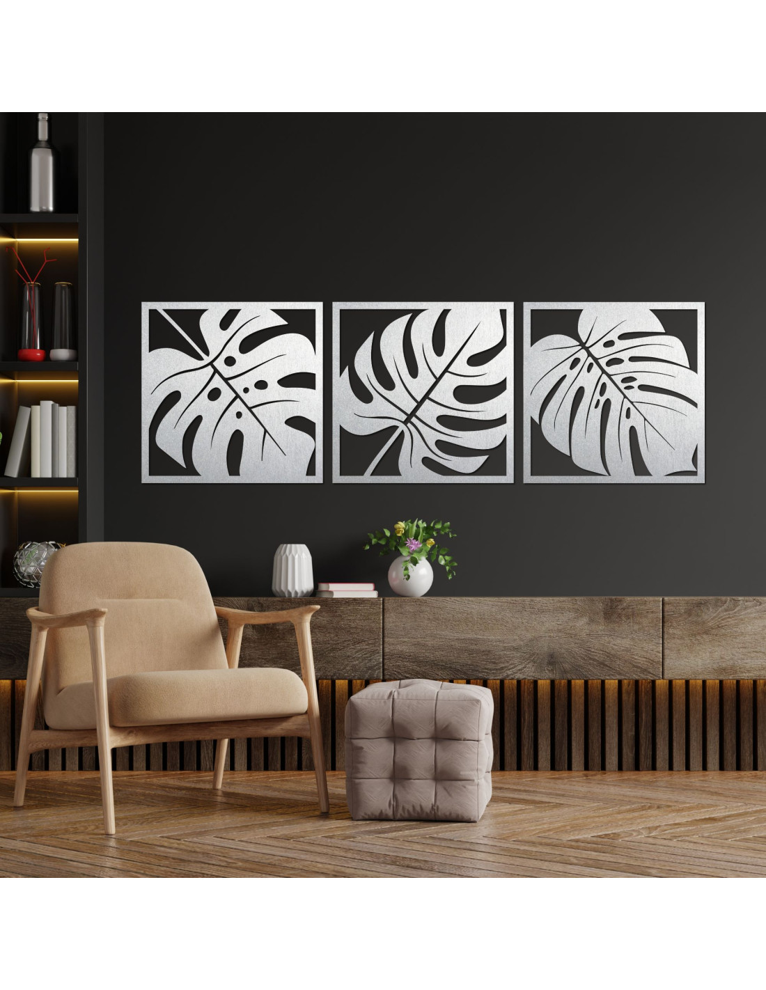 Präzise geschnitzte Linien fangen die natürliche Schönheit der Monstera-Blätter ein und verleihen dem Raum einen modernen und einzigartigen Charakter .