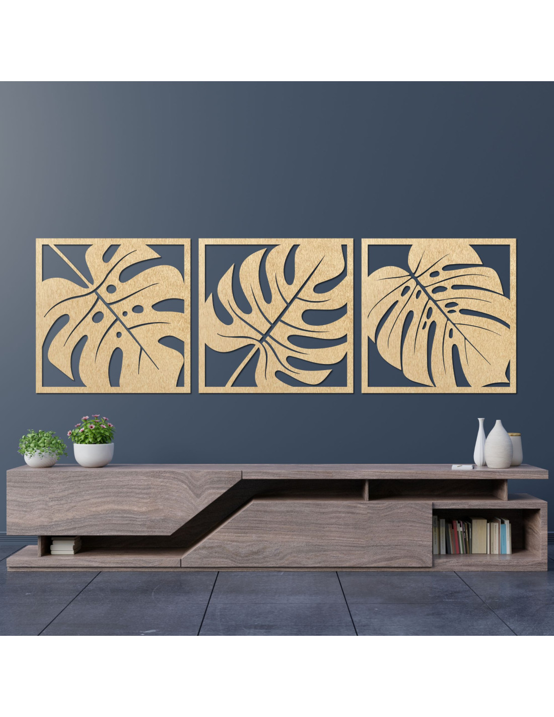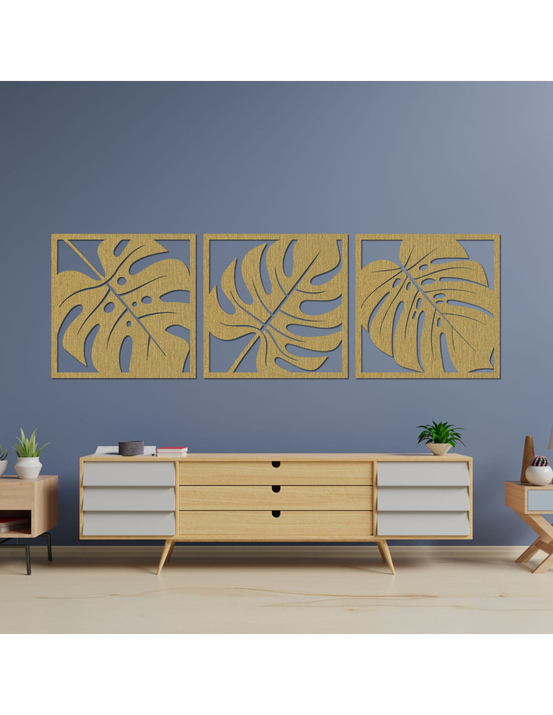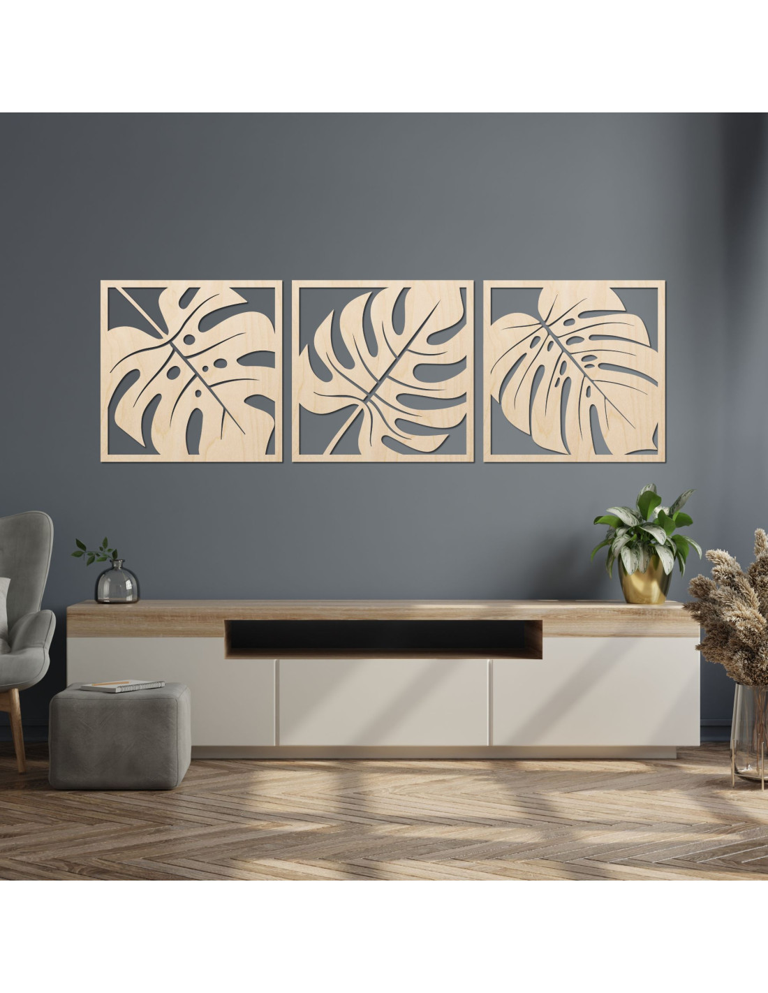 Monstera-Bild aus Holz – 3-teilige Wanddekoration