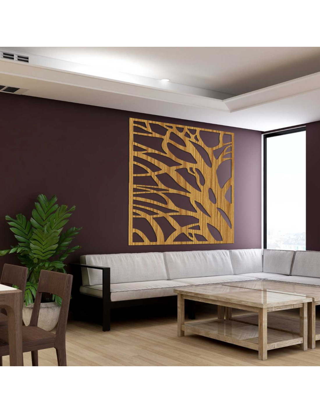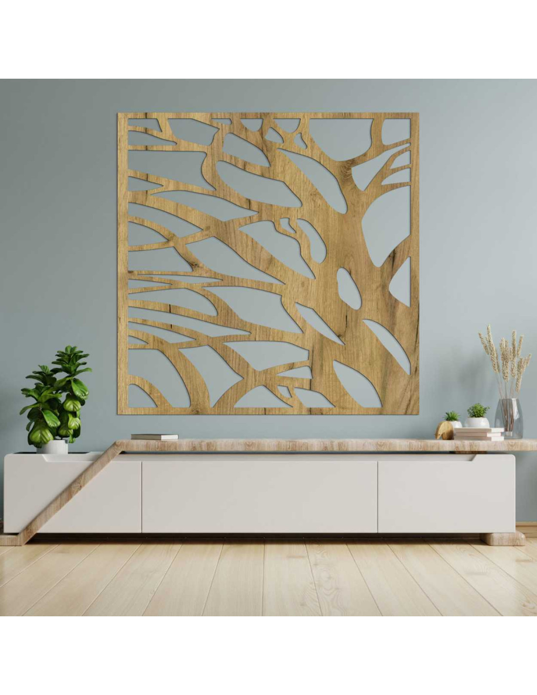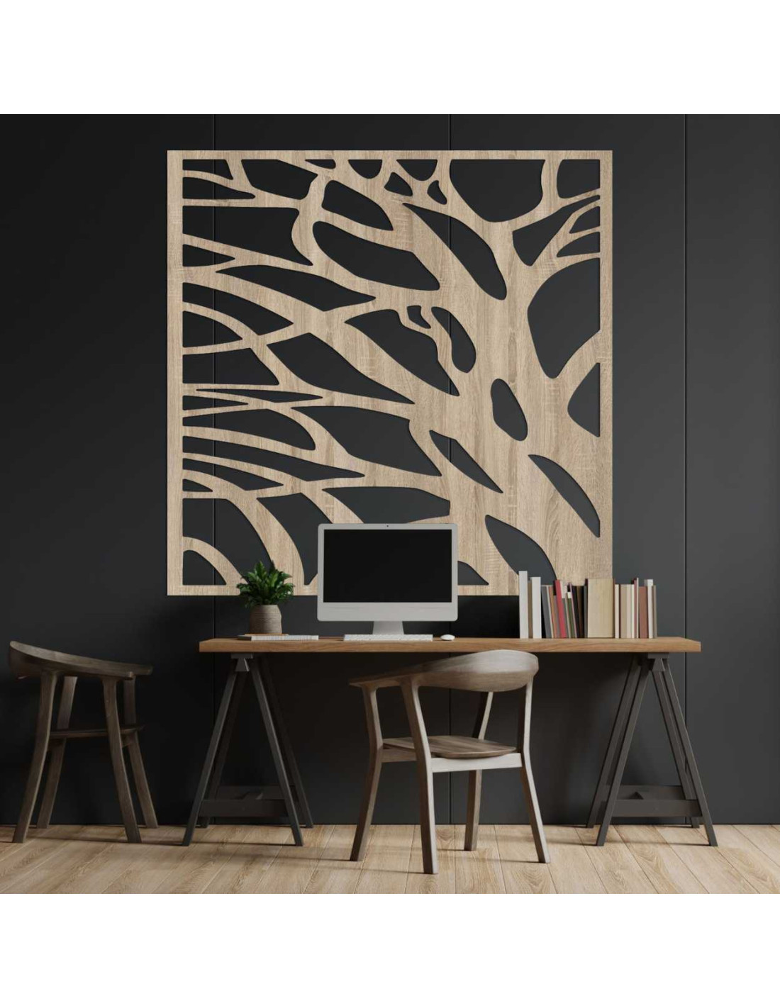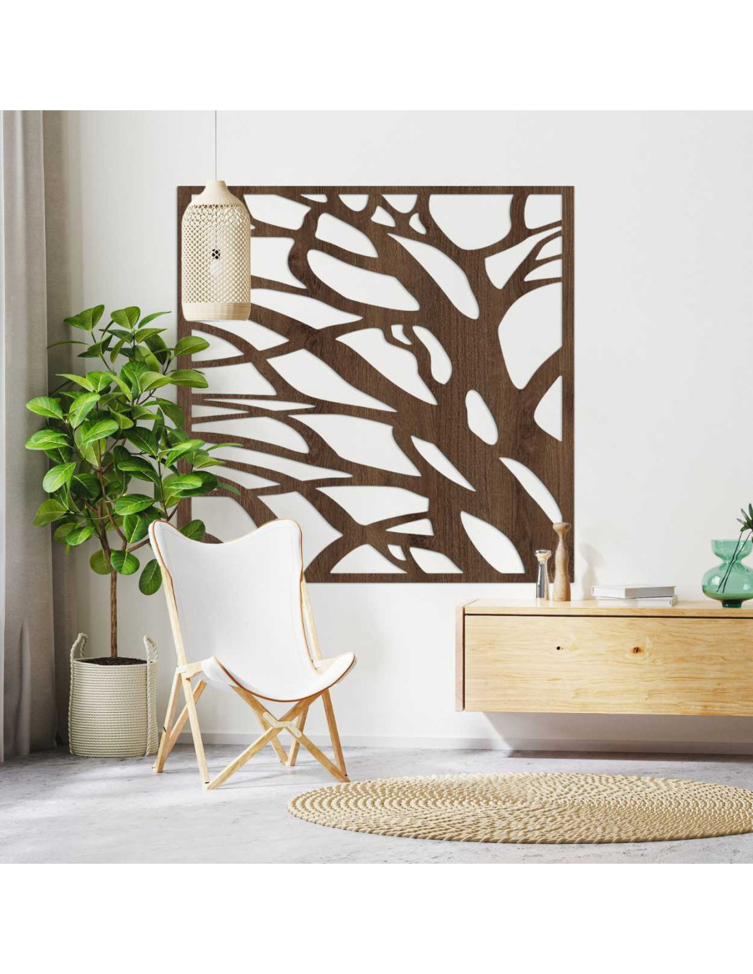 Die moderne Wanddekoration mit einem aus Holz geschnitzten Baummotiv bringt natürliches Flair und stilvolle Tiefe in den Raum.