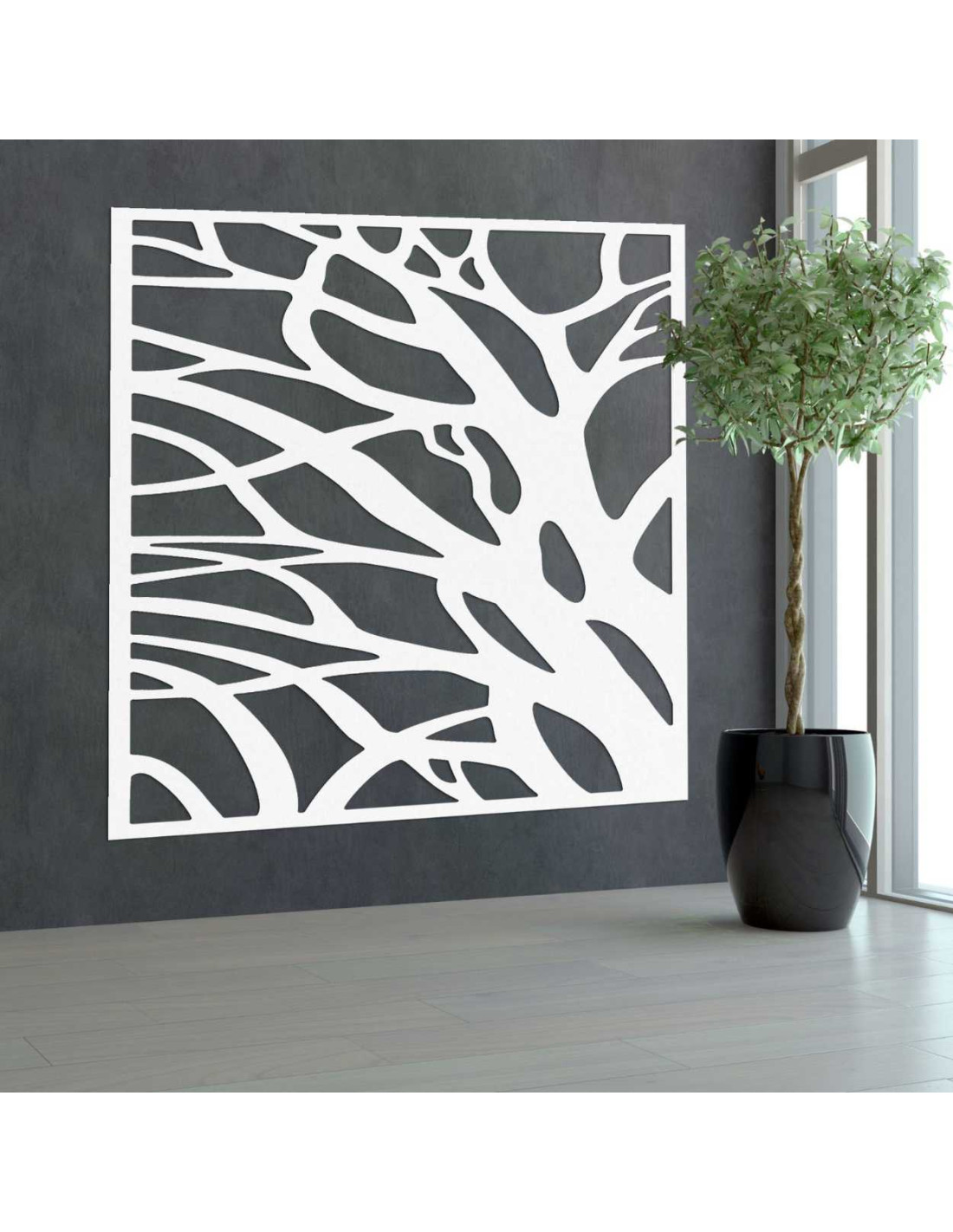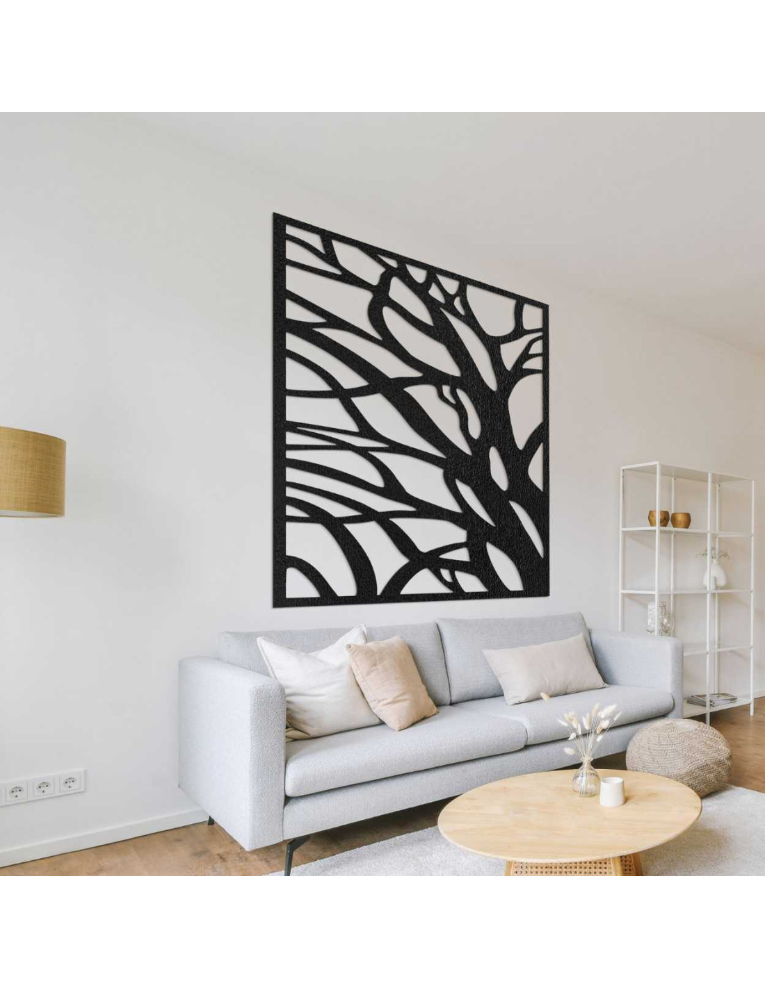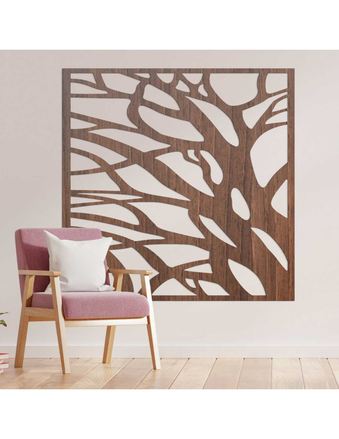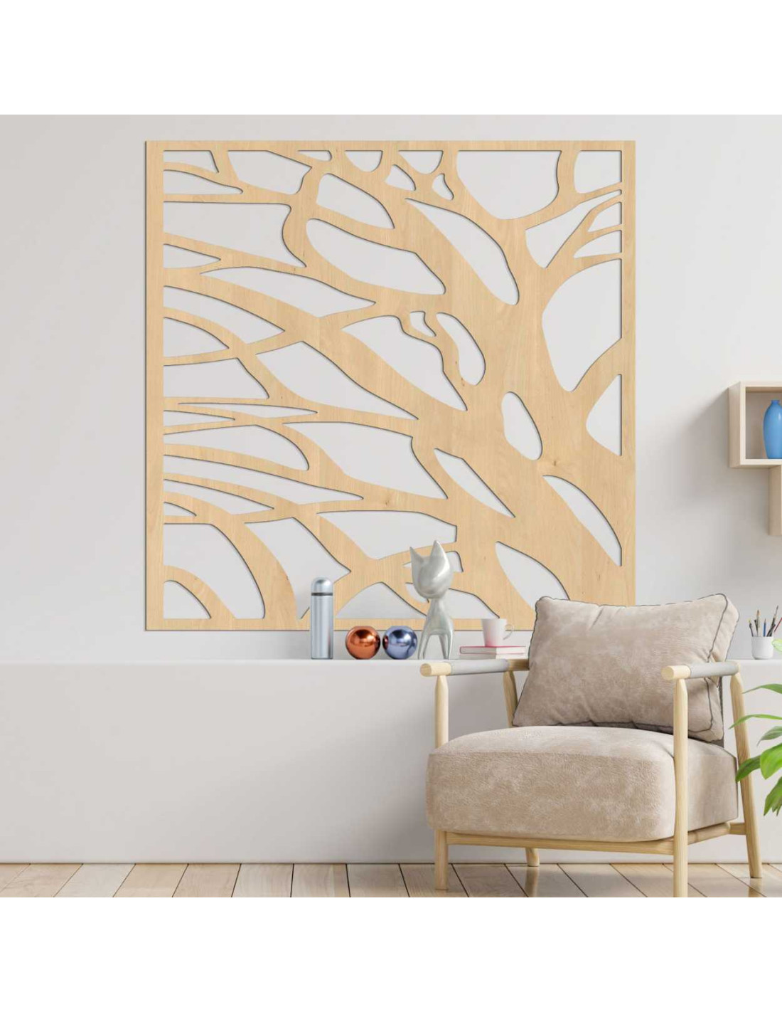 Die moderne Wanddekoration mit einem aus Holz geschnitzten Baummotiv bringt natürliches Flair und stilvolle Tiefe in den Raum.