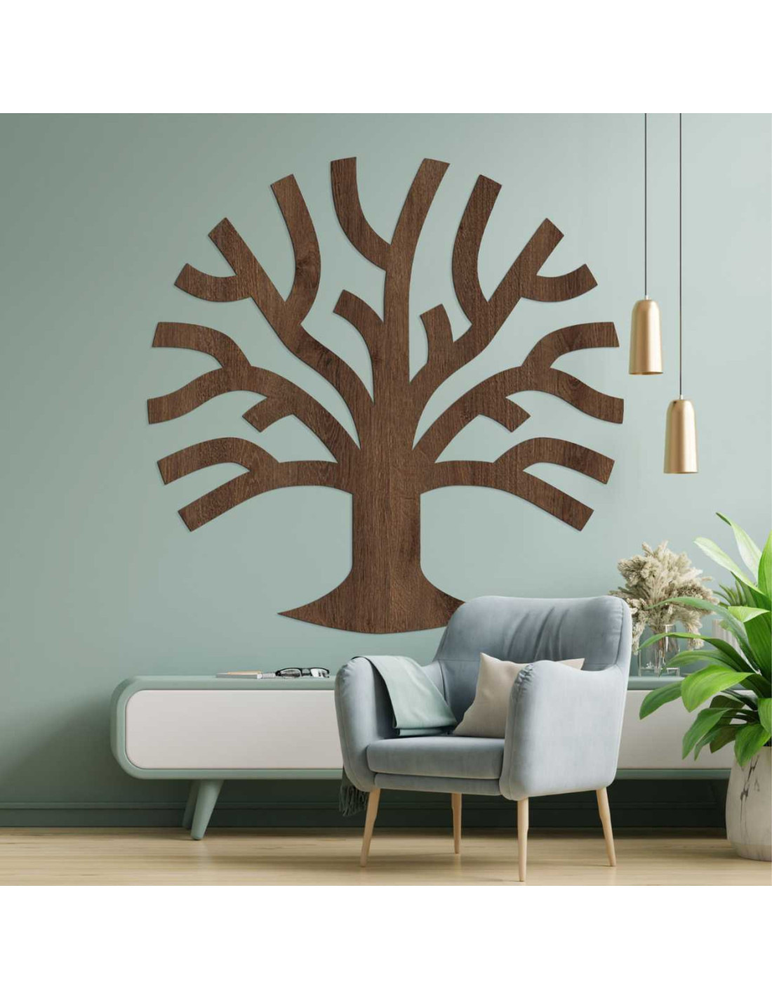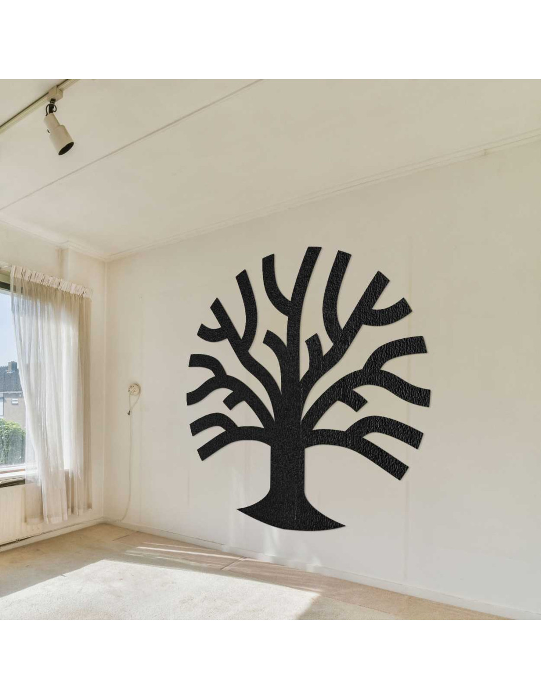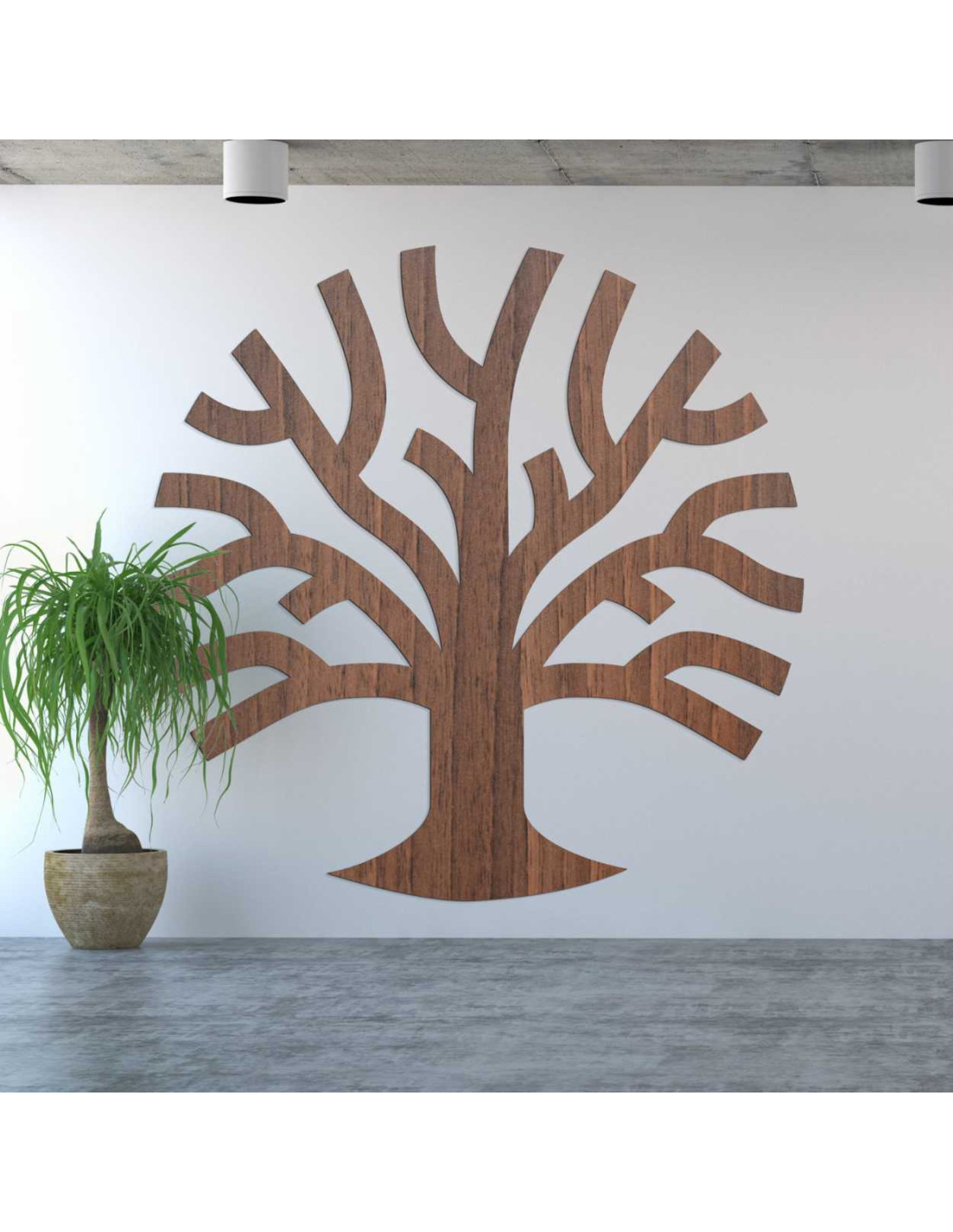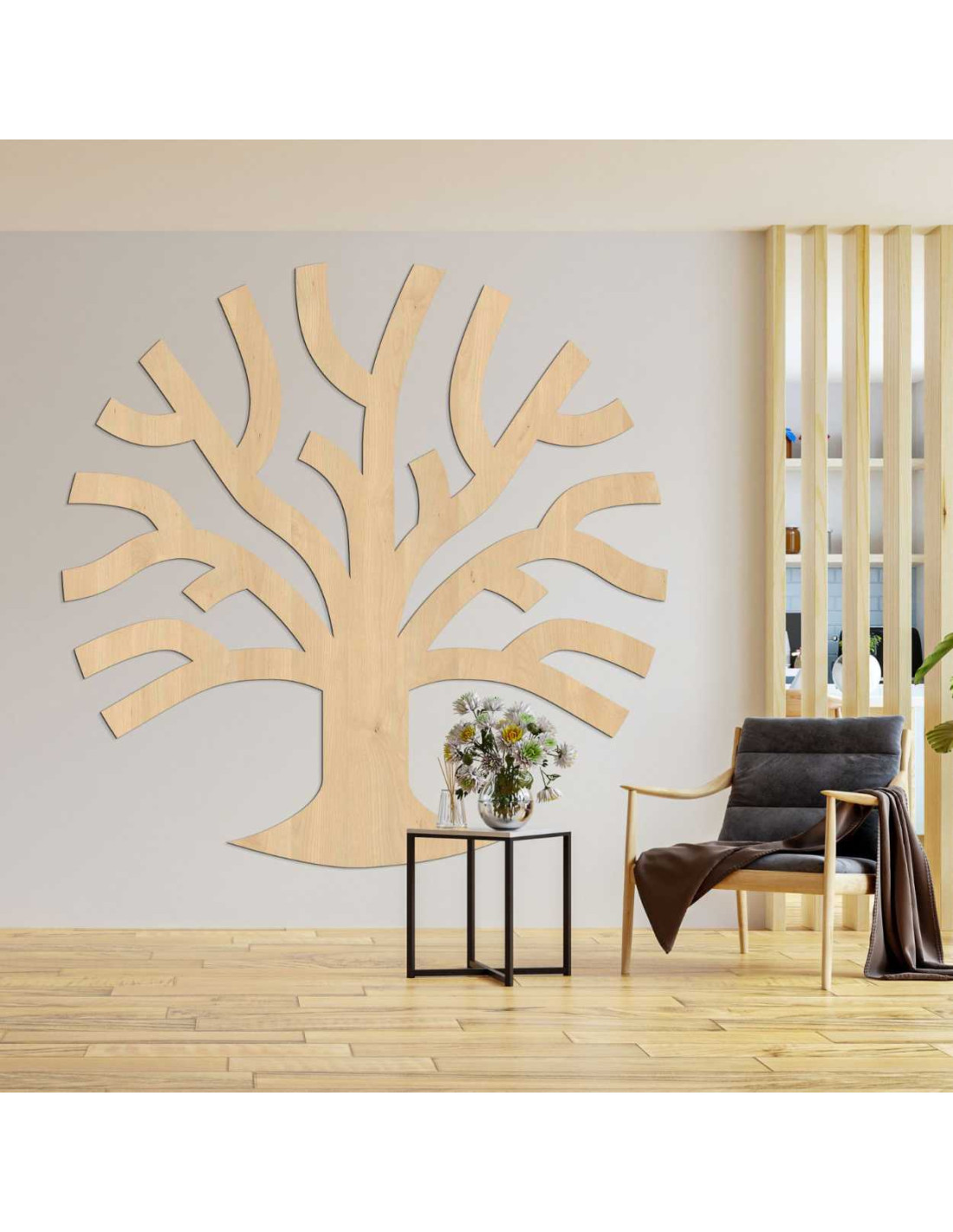 Die Baum -Wanddekoration aus Holz besticht durch ihre klaren Linien und die organische Form.