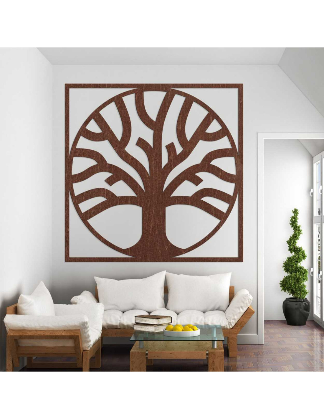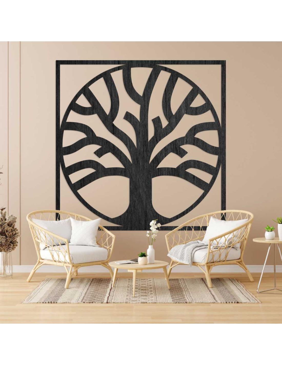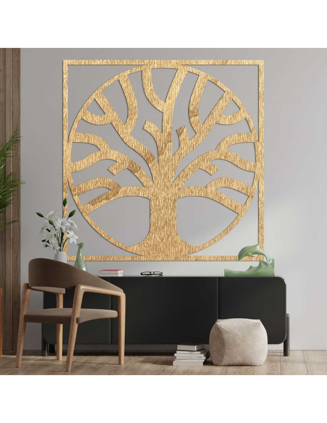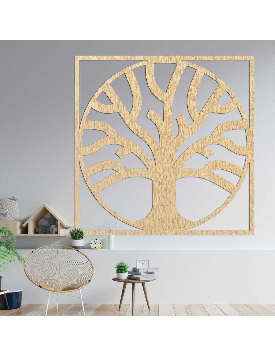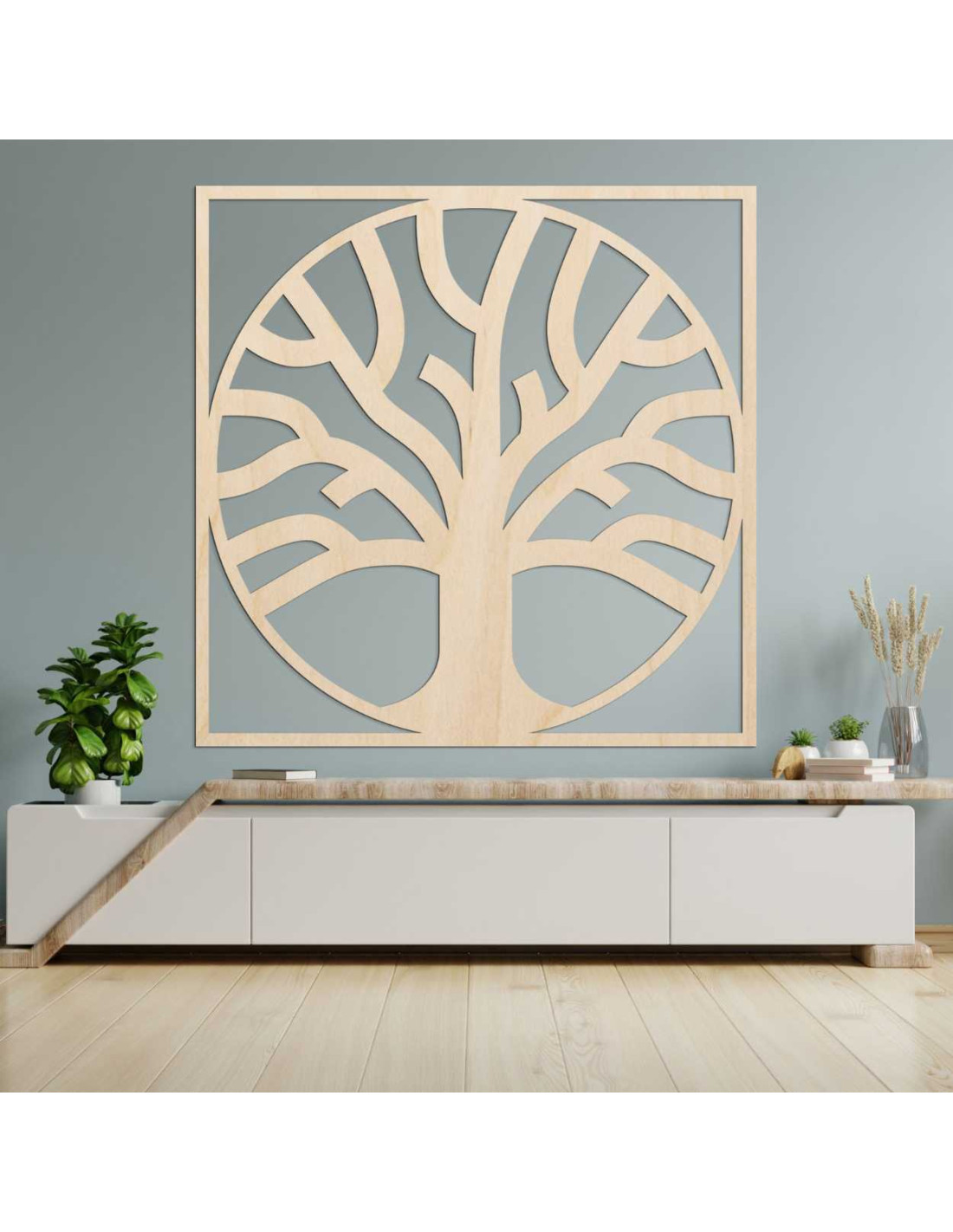 Lebensbaum aus Holz mit runder Form und quadratischem Rahmen.