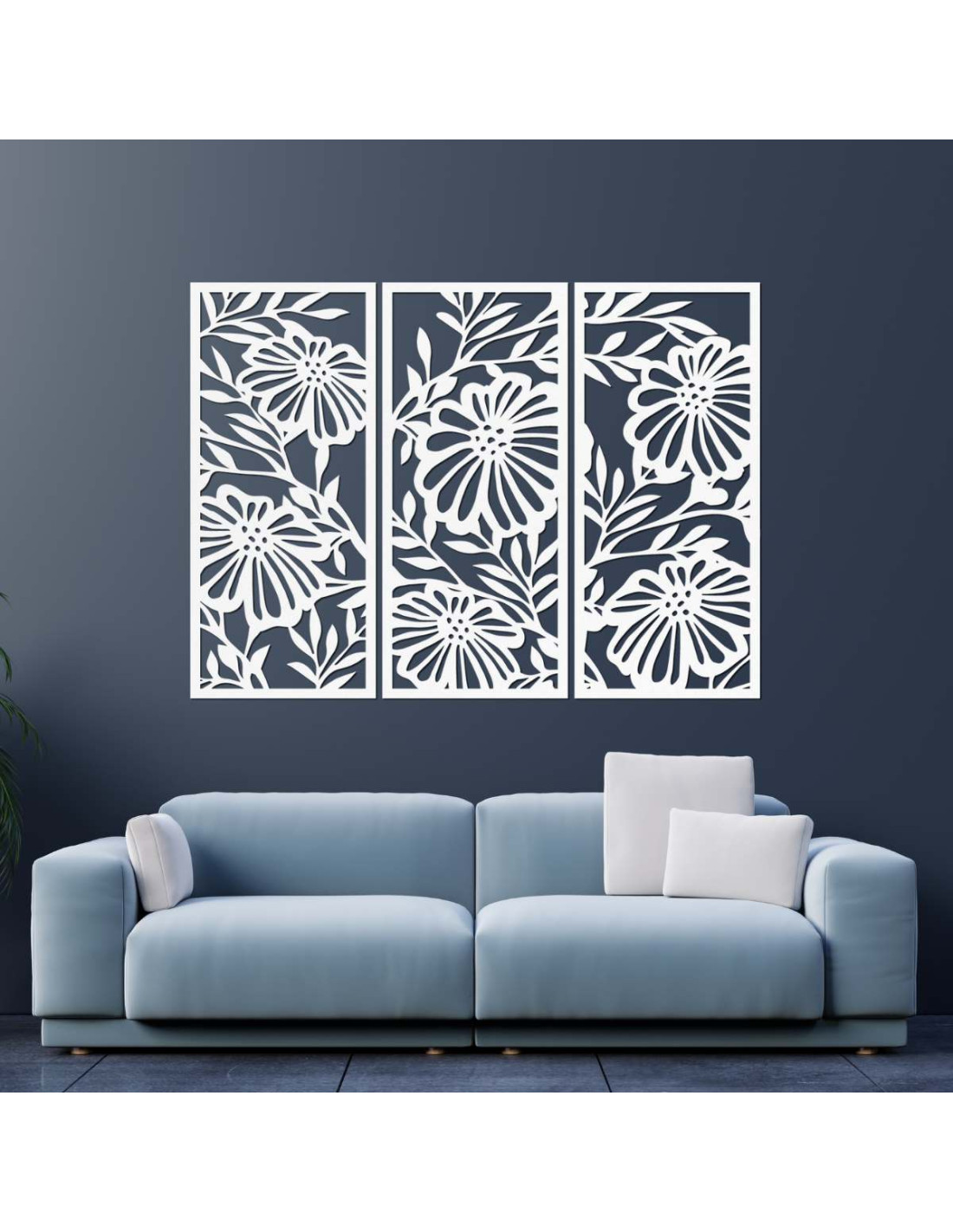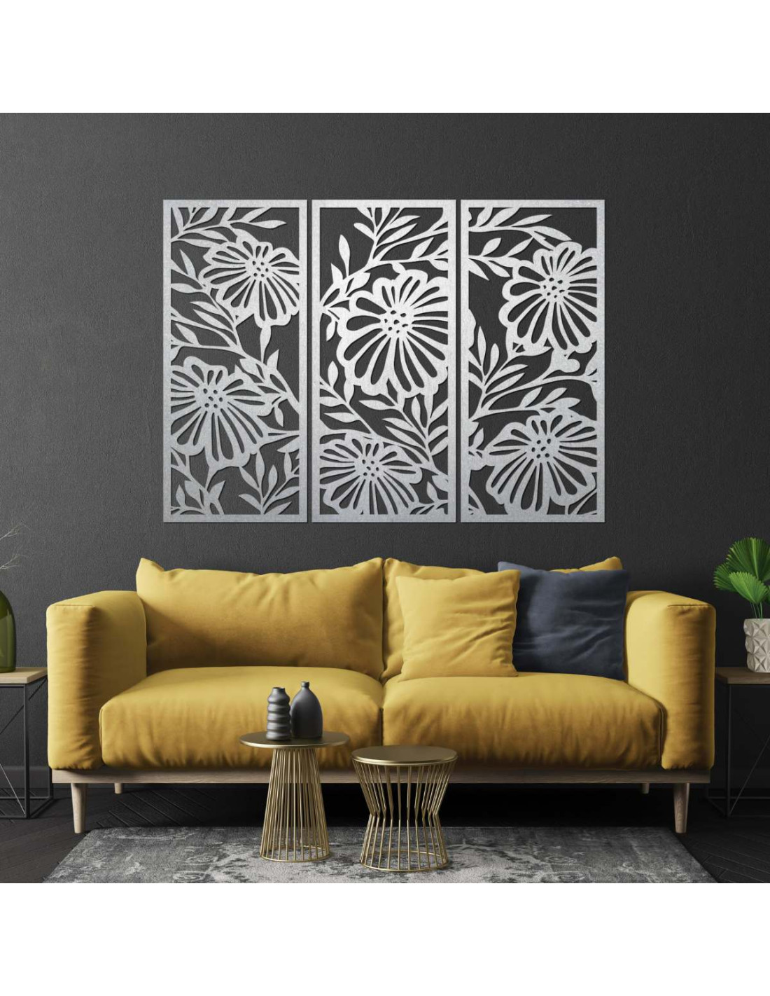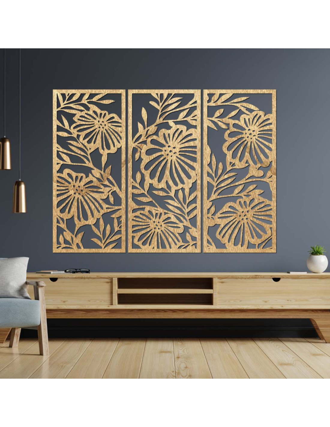 Ein dreiteiliges Holzbild mit Blumenmotiv ist eine stilvolle und natürliche Dekoration, die jedes Interieur belebt.