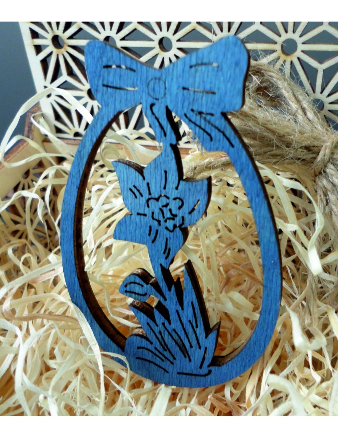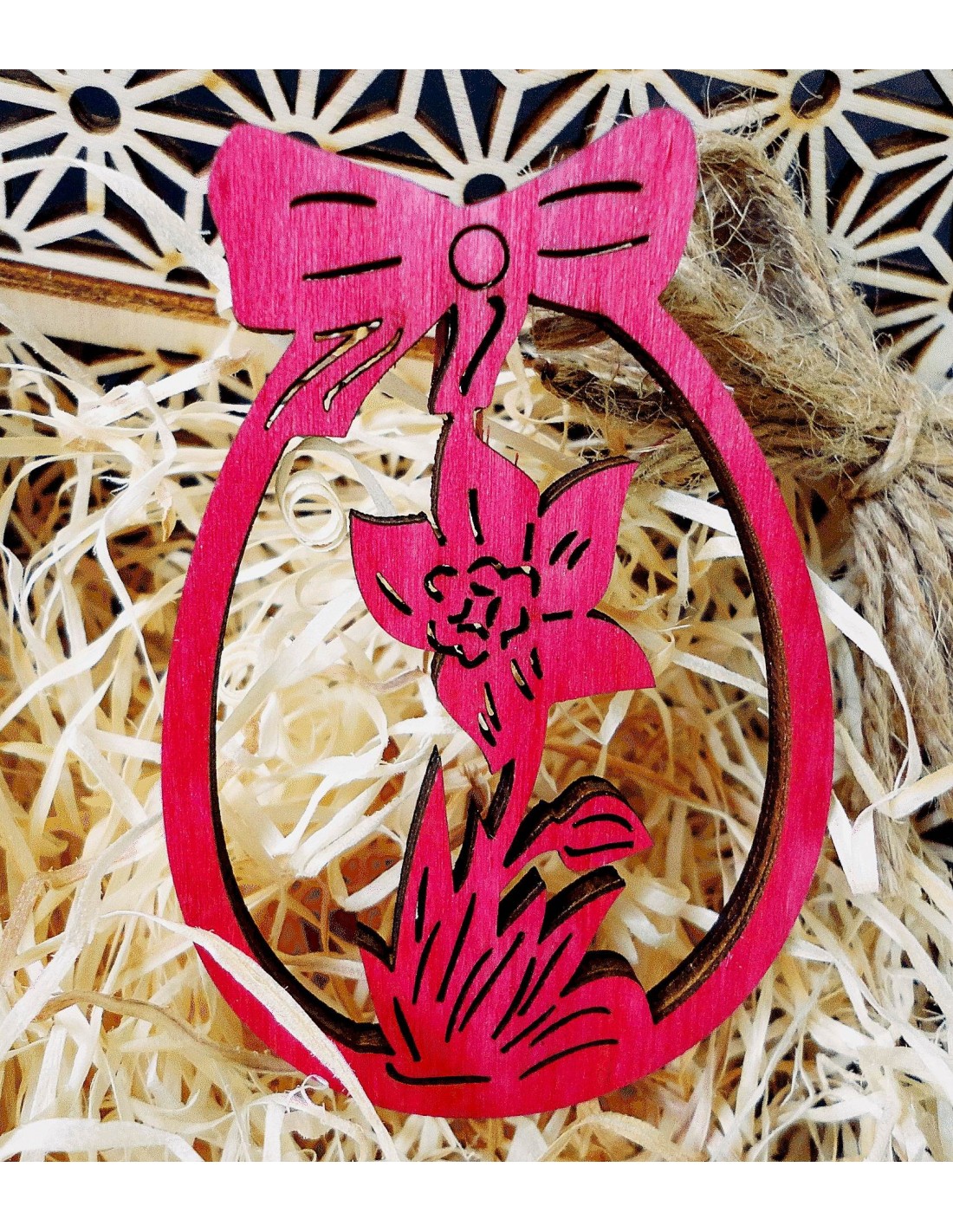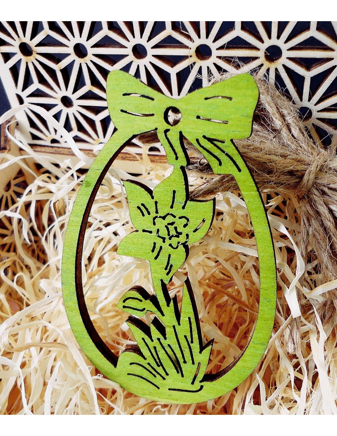 Osterdeko aus Holz mit Blumenmotiv und Schleife
