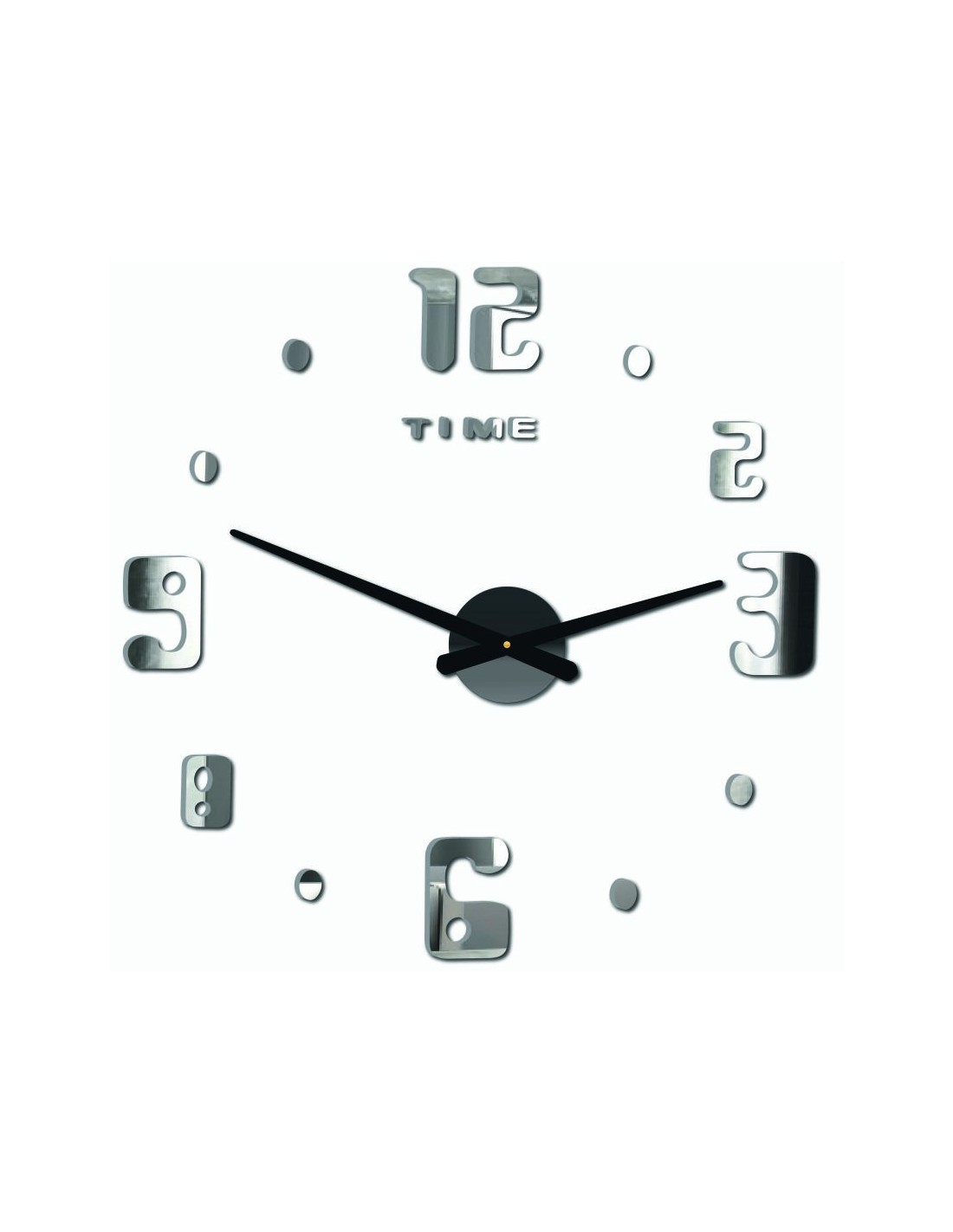 Uhr mit originellen, großen Zahlen in unterschiedlichen Größen und silbernen Zeigern.