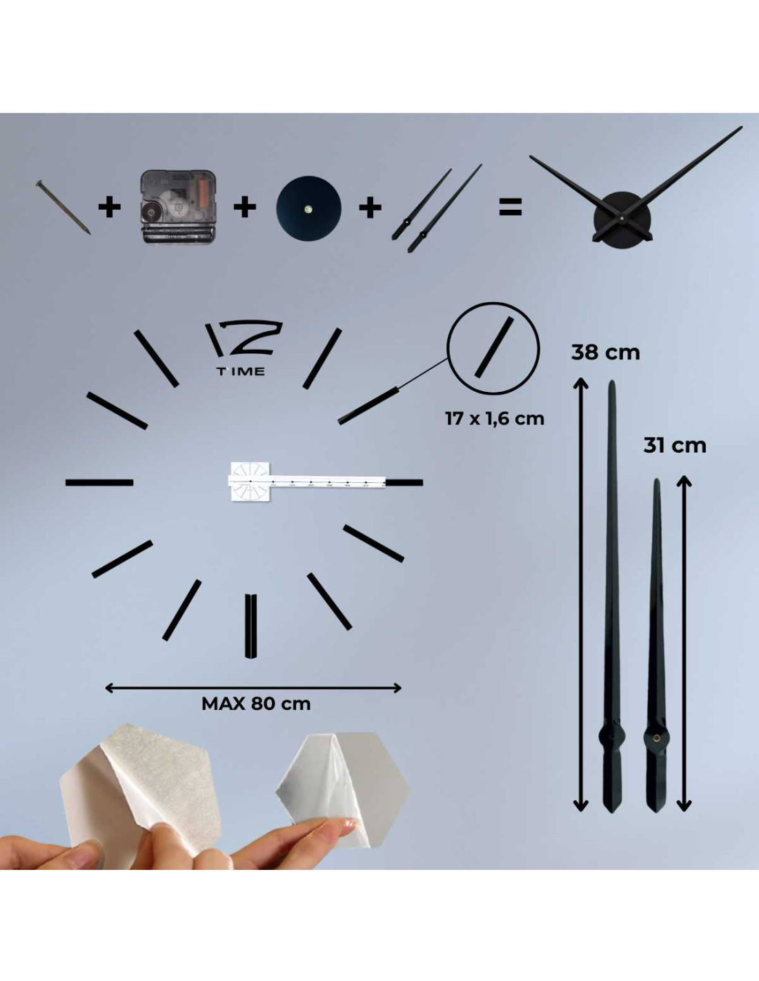 - Die Ziffernblätter verfügen über eine selbstklebende Schicht, sodass die Montage schnell und ohne Bohren möglich ist.
