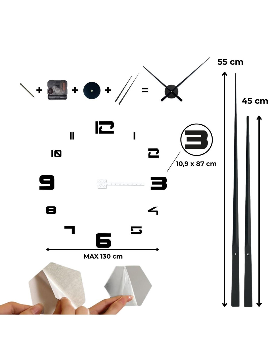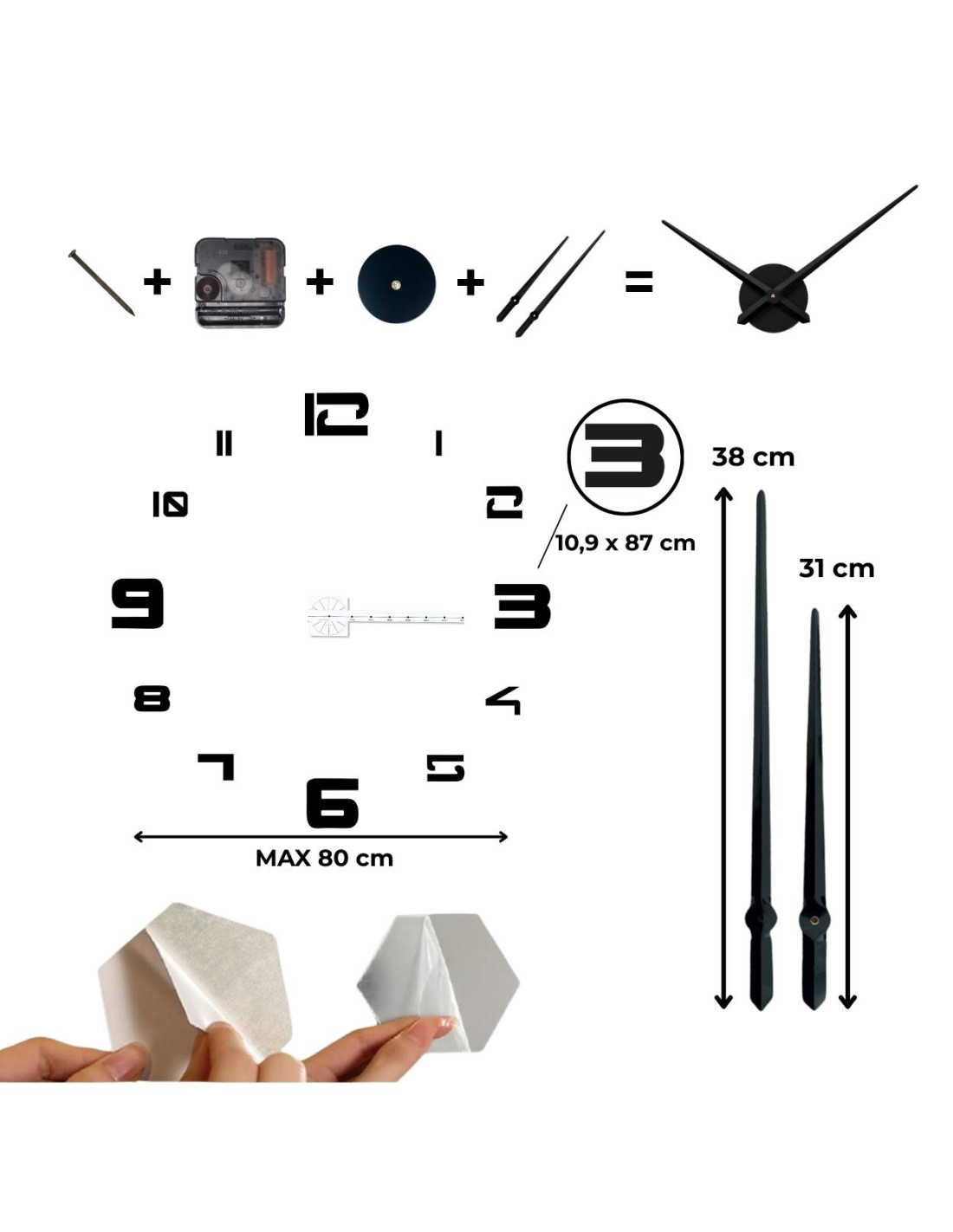 - Die Ziffernblätter verfügen über eine selbstklebende Schicht, sodass die Montage schnell und ohne Bohren möglich ist.