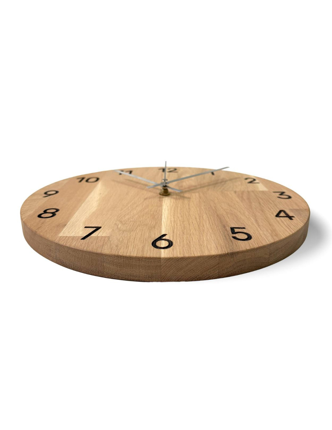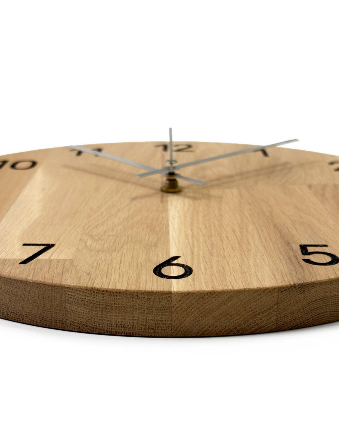Jede Uhr besteht aus massiven Eichenplatten, die zunächst mithilfe der CNC-Technologie präzise in die gewünschte Form und Größe geschnitten werden .