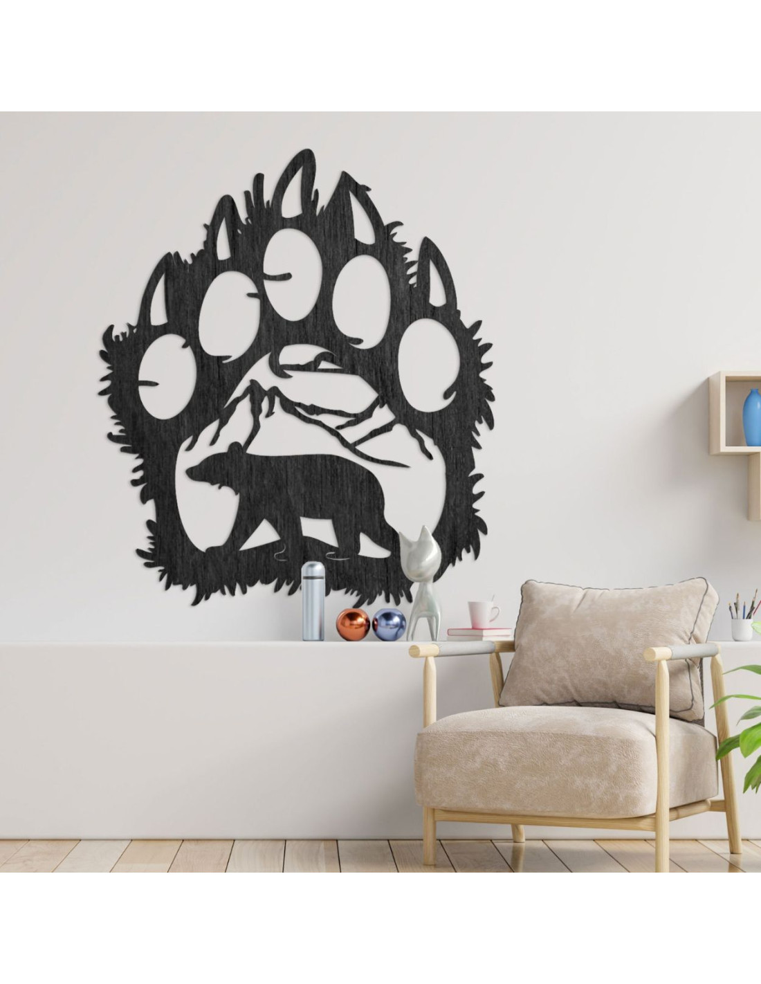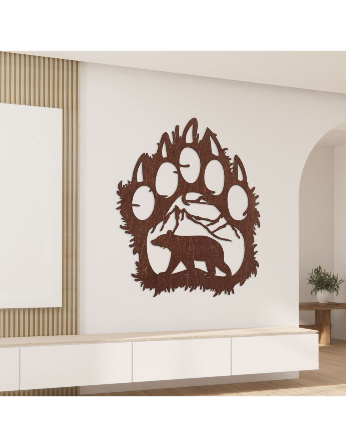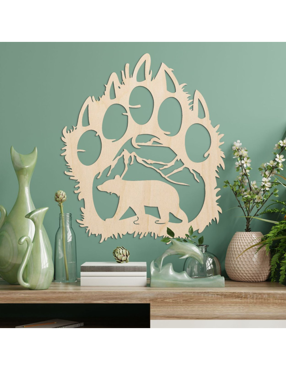 Ein Holzbild eines Bärenfußabdrucks mit einer Bärensilhouette und einer Berglandschaft symbolisiert Stärke, Mut, Freiheit und Verbundenheit mit der Natur.