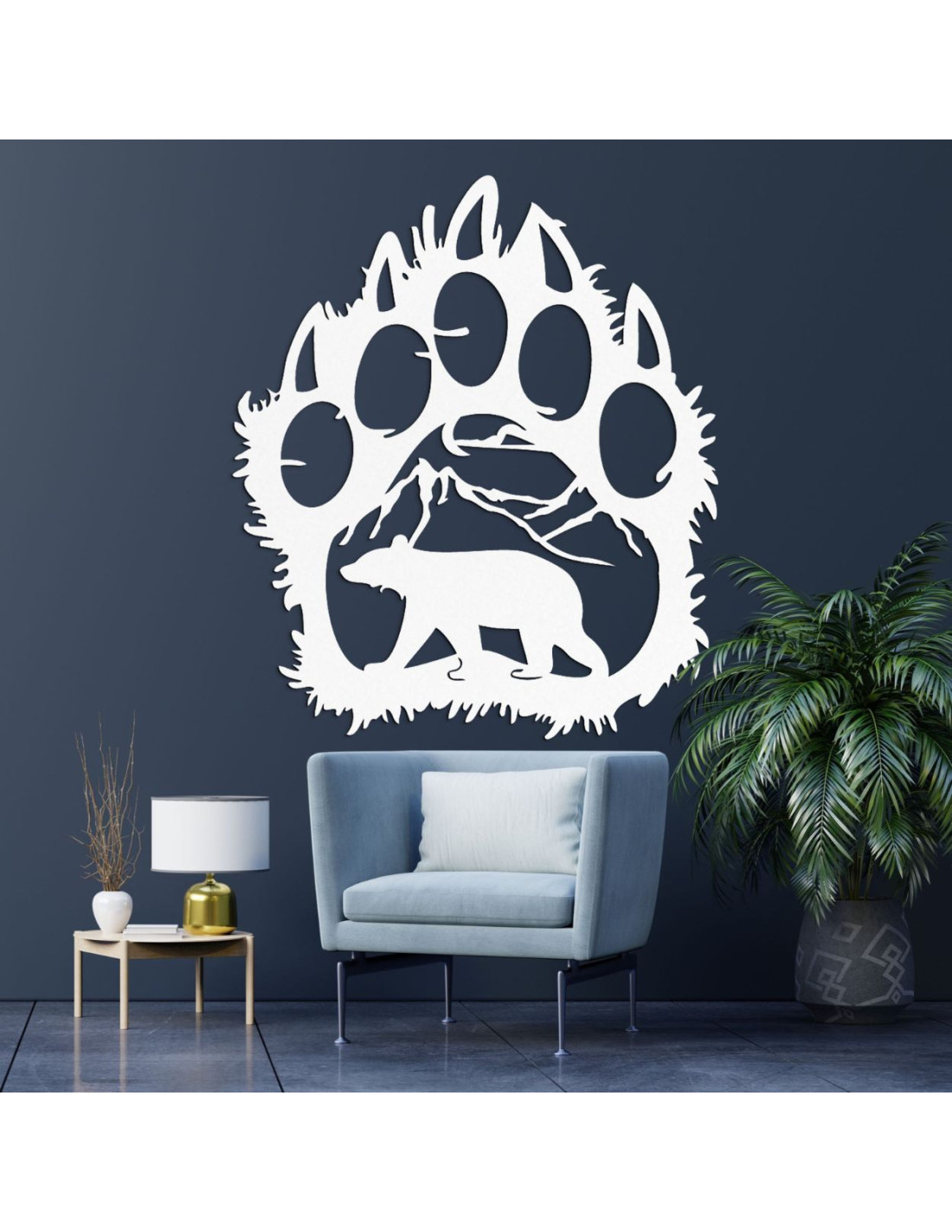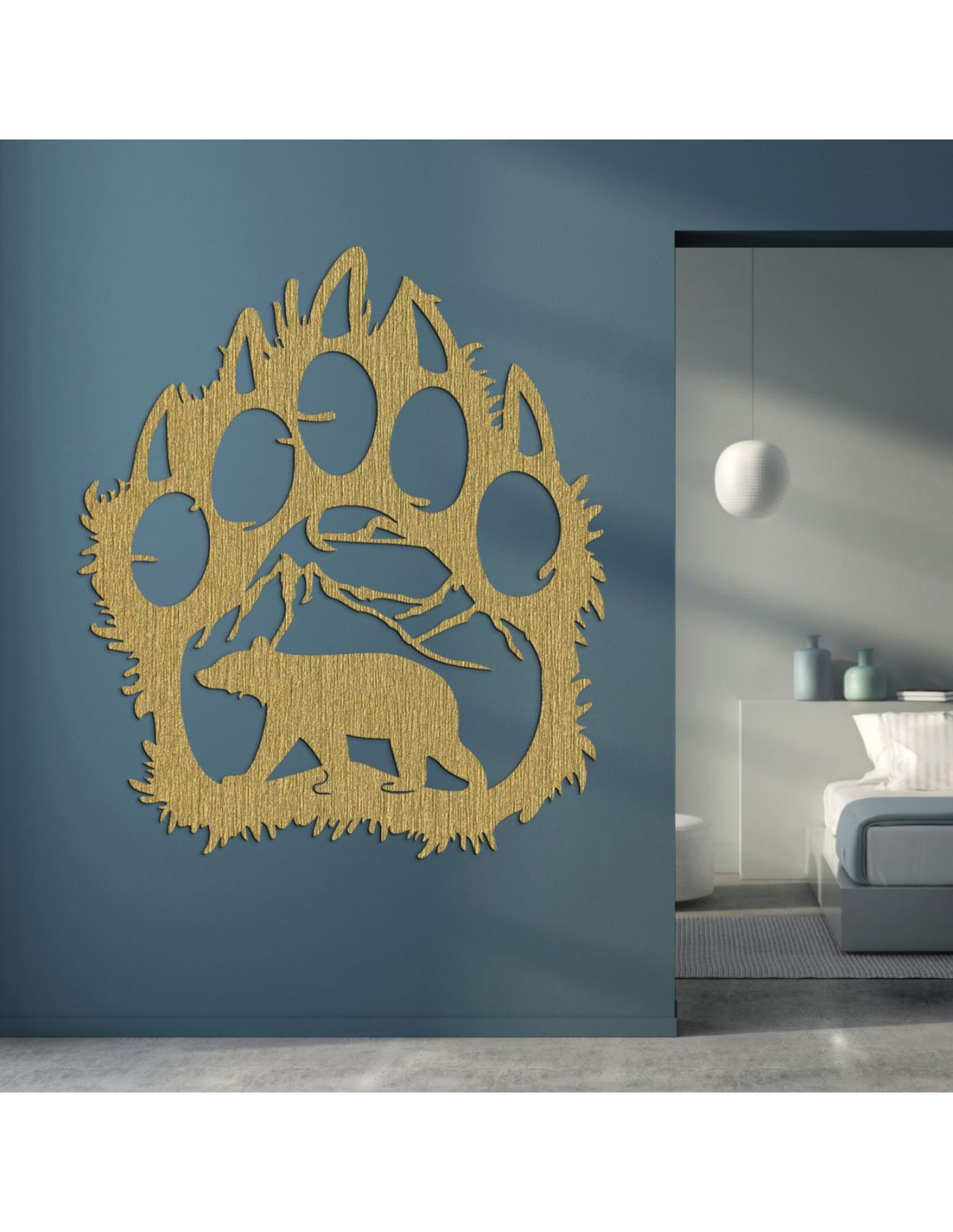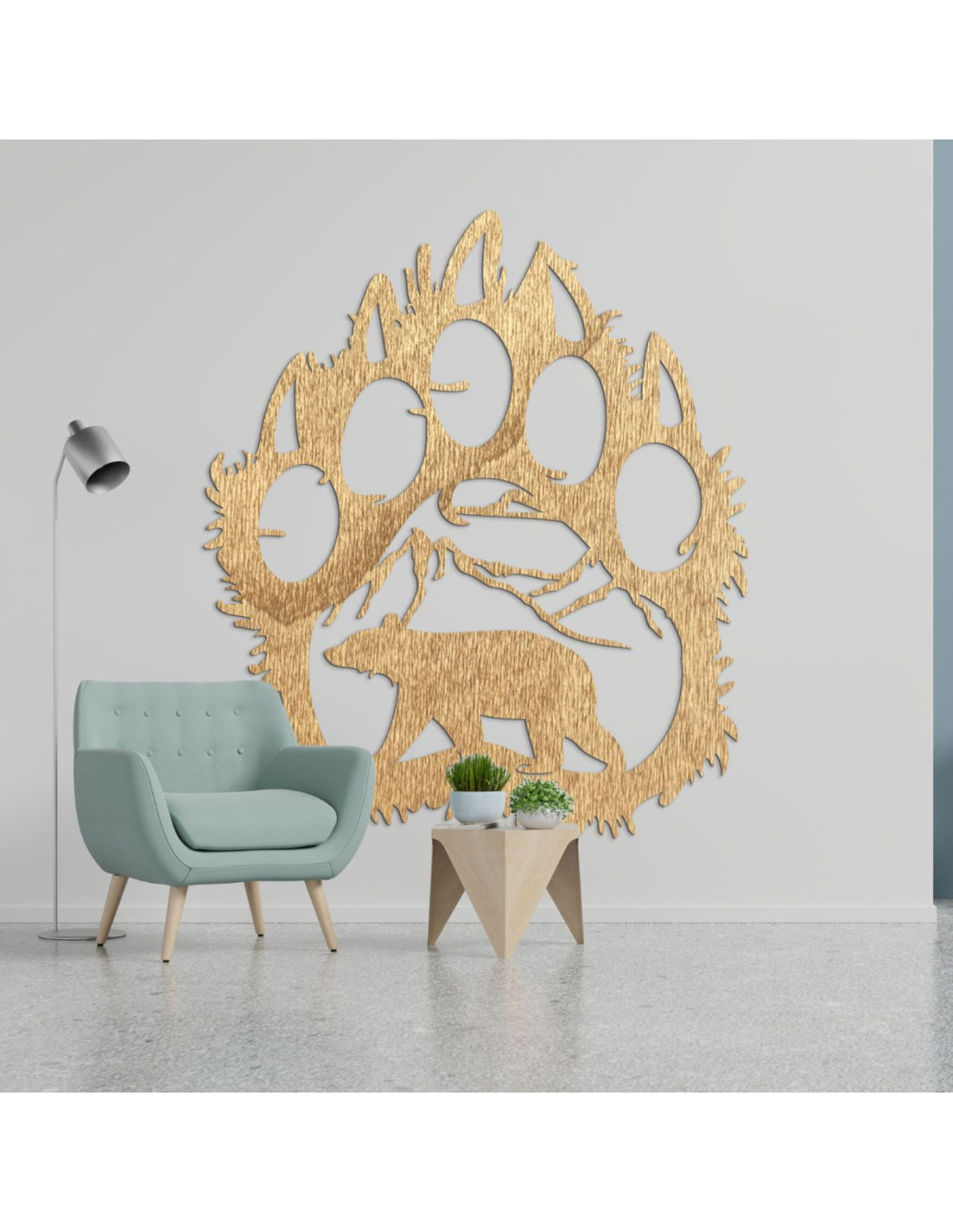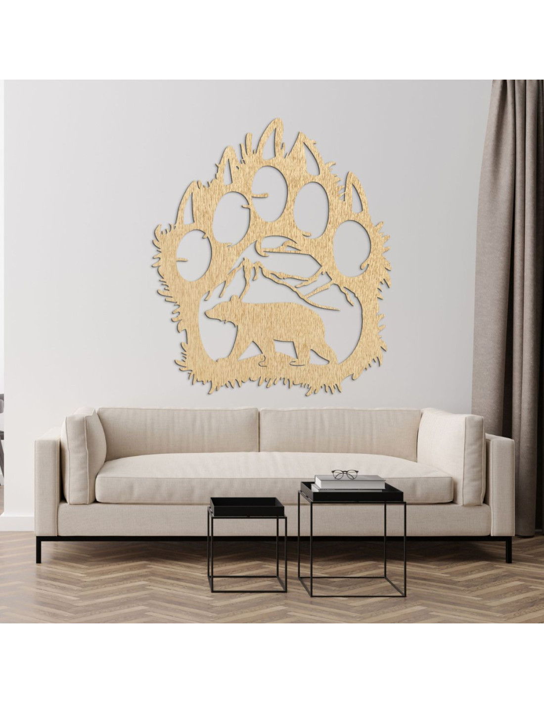 Ein Holzbild eines Bärenfußabdrucks mit einer Bärensilhouette und einer Berglandschaft symbolisiert Stärke, Mut, Freiheit und Verbundenheit mit der Natur.