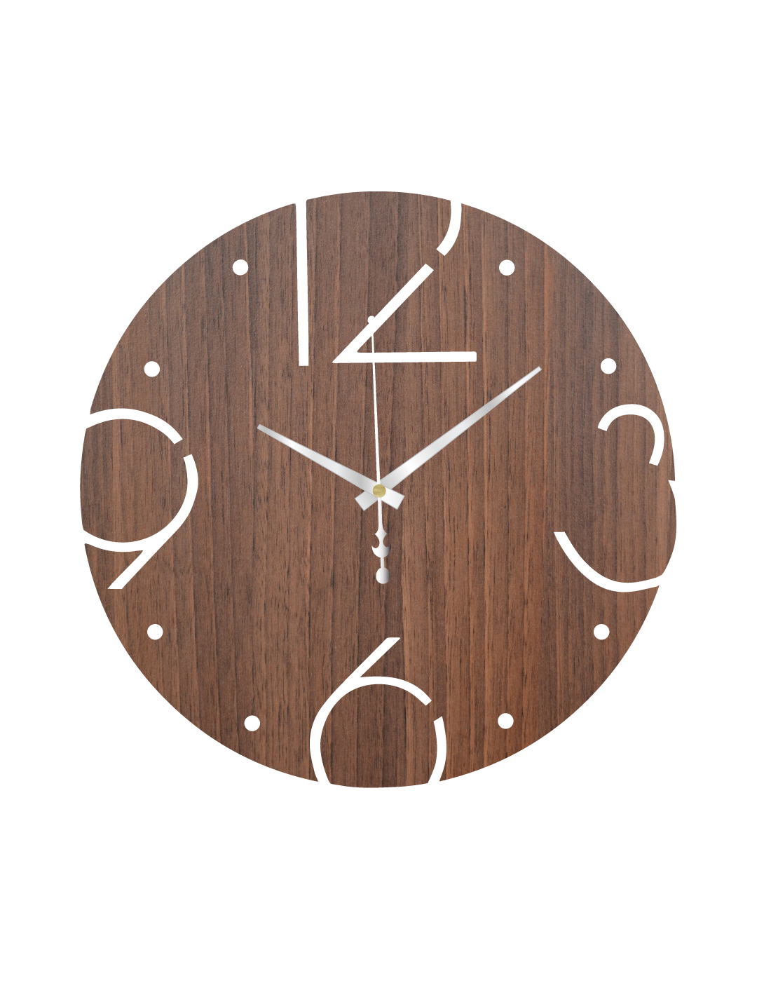 Das minimalistische Zifferblatt mit den geschnitzten Ziffern 3, 6, 9 und 12 bildet einen auffälligen und eleganten Kontrast zur Holzstruktur.