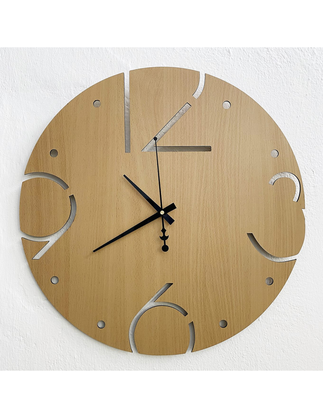 Runde Wanduhr mit ausgestanzten Zahlen, rahmenlos, in natürlicher Holzoptik.