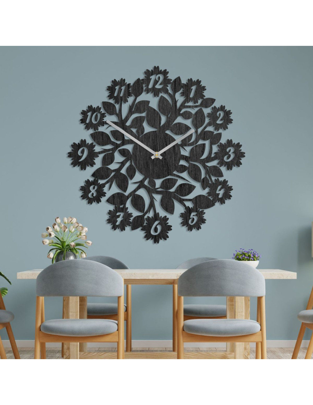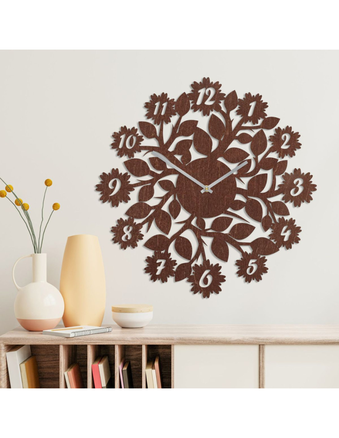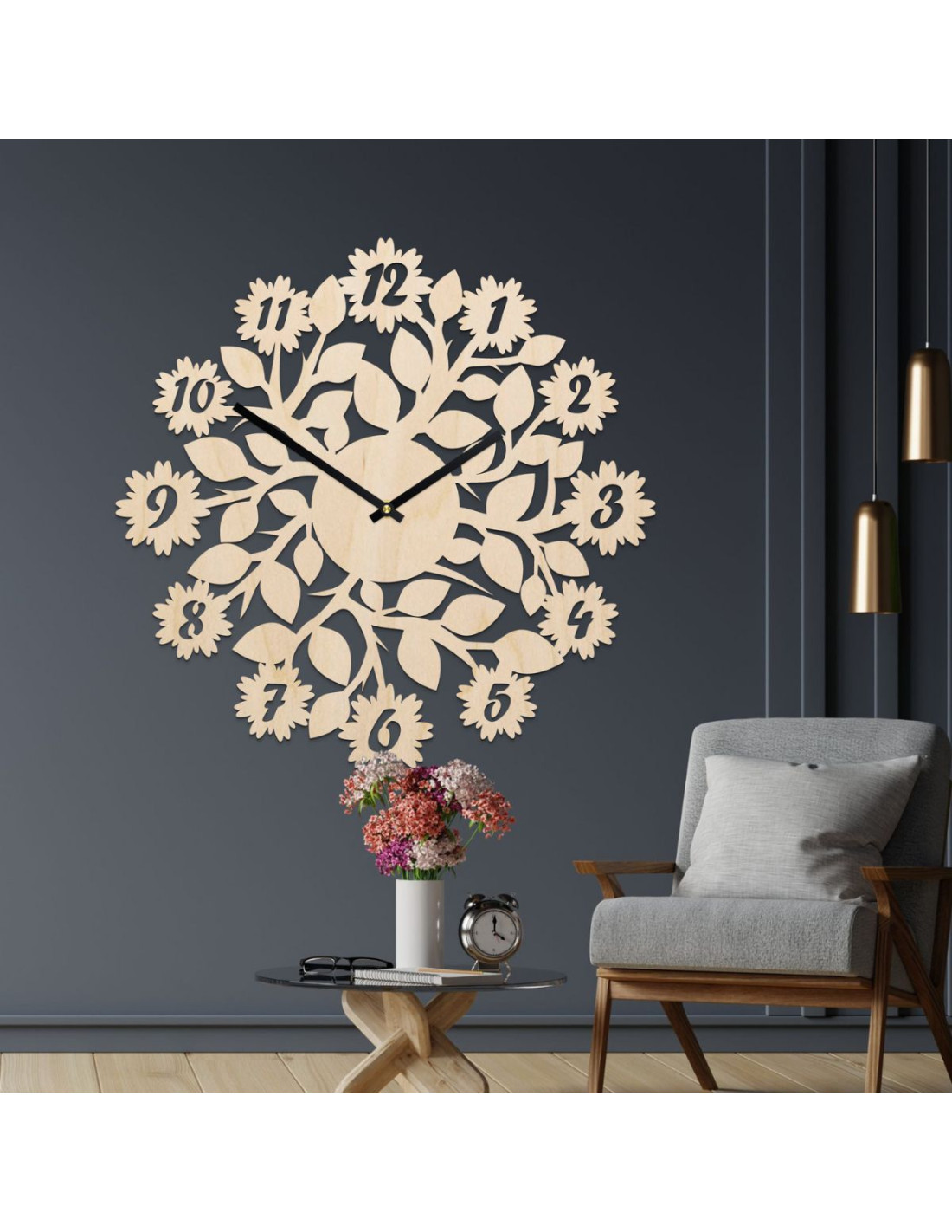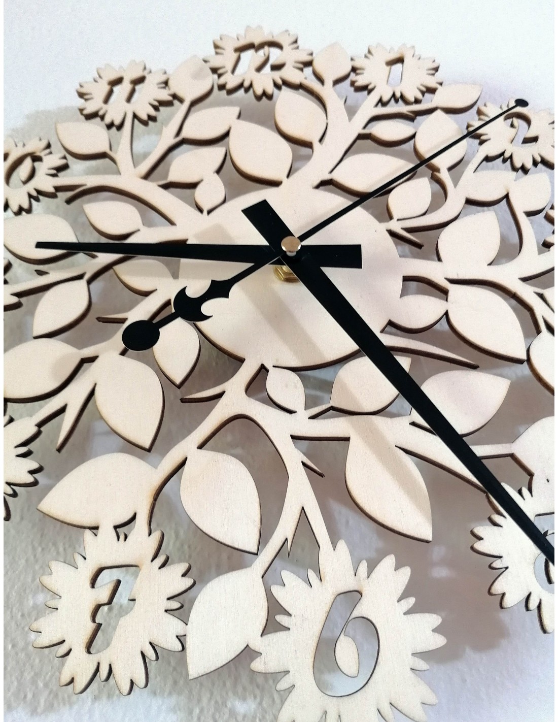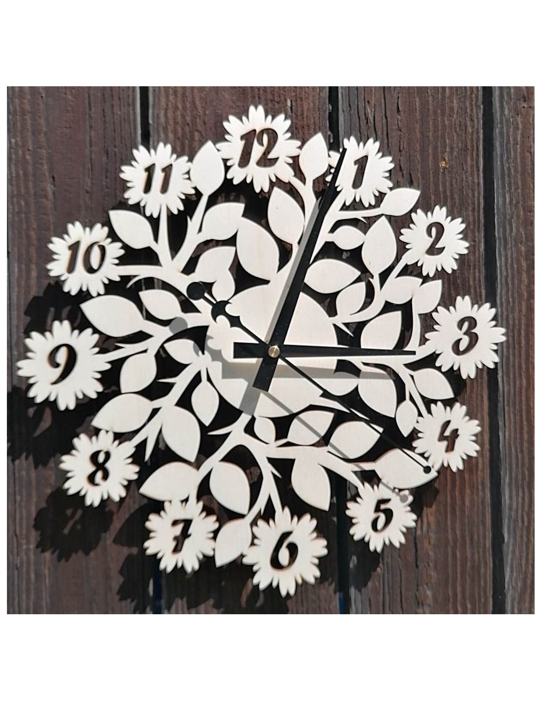 Elegante Holzuhr mit geräuschlosem Lauf und zartem Blumenmotiv. Natürliches Design, das sowohl zu modernen als auch zu rustikalen Innenräumen passt.