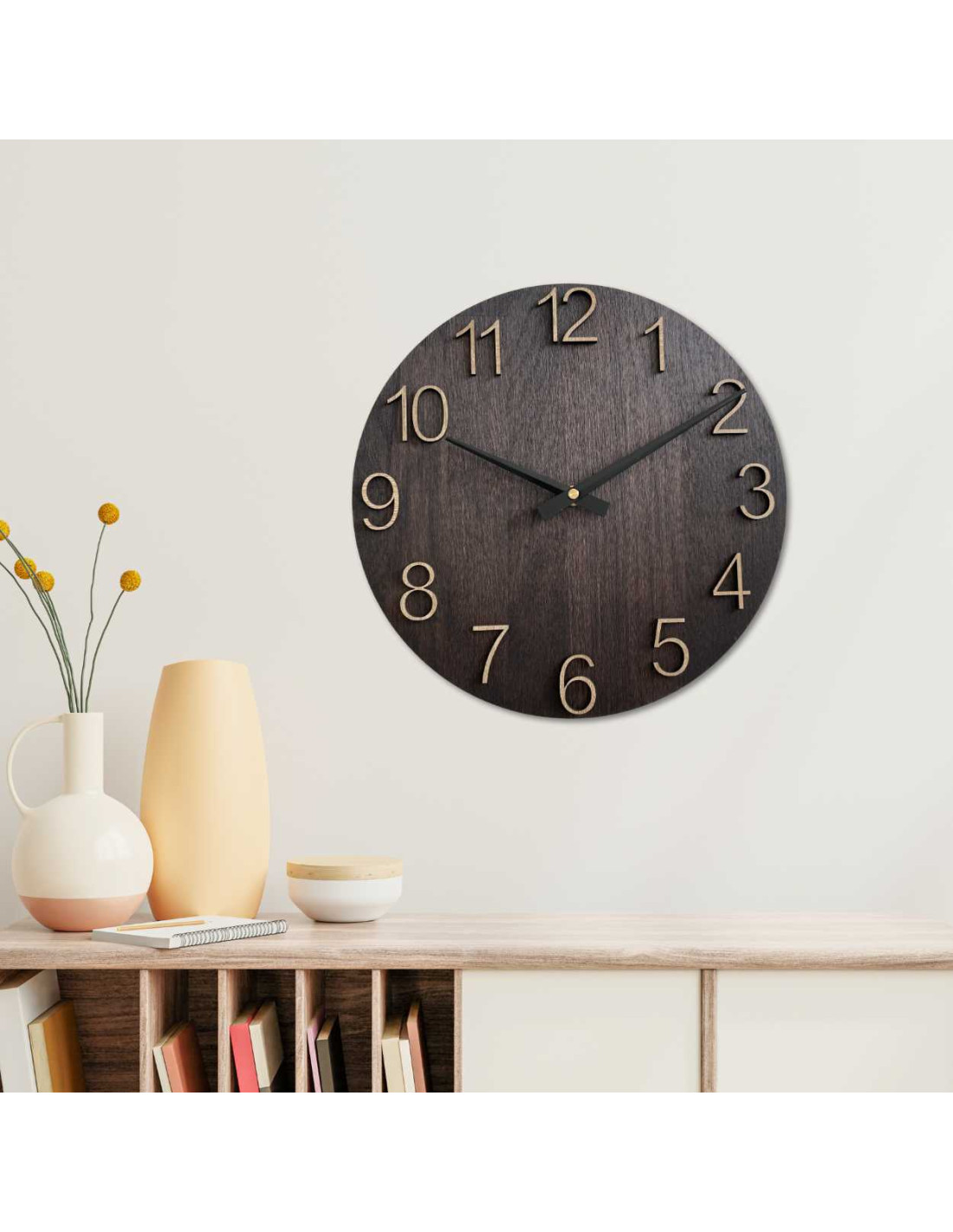 Zeitlose Wanduhr aus Holz mit geschnitztem Motiv