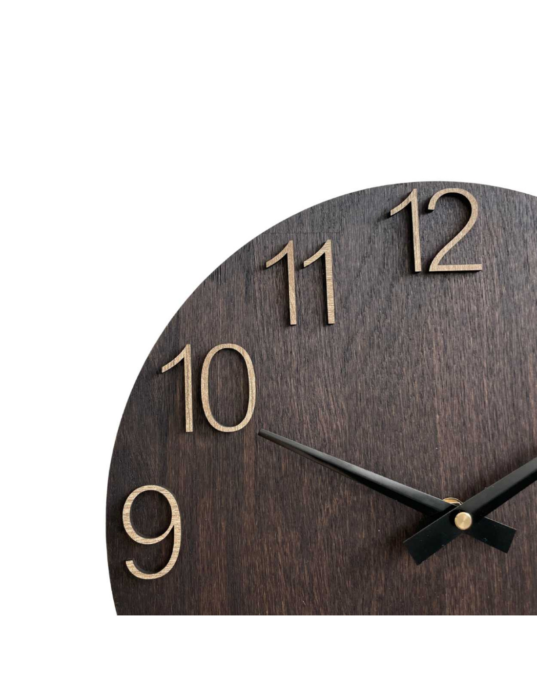 Moderne Holzuhr mit schlichtem Zifferblatt und Metallzeigern.