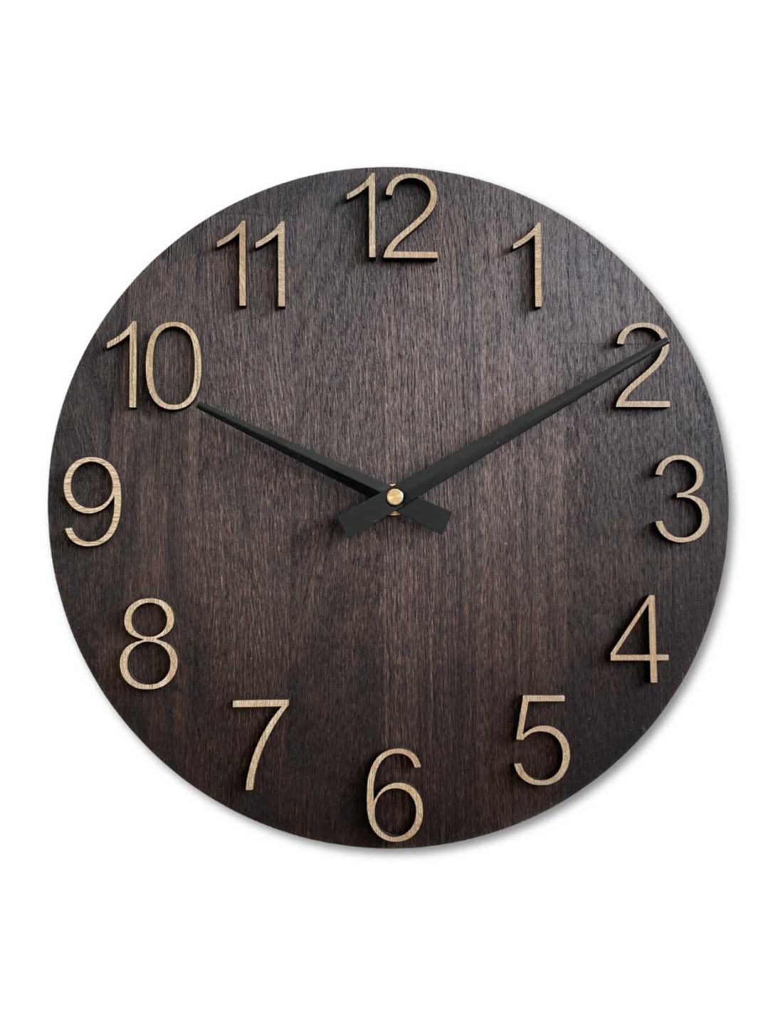 Einfache Wanduhr aus Holz mit kontrastierenden Zeigern.