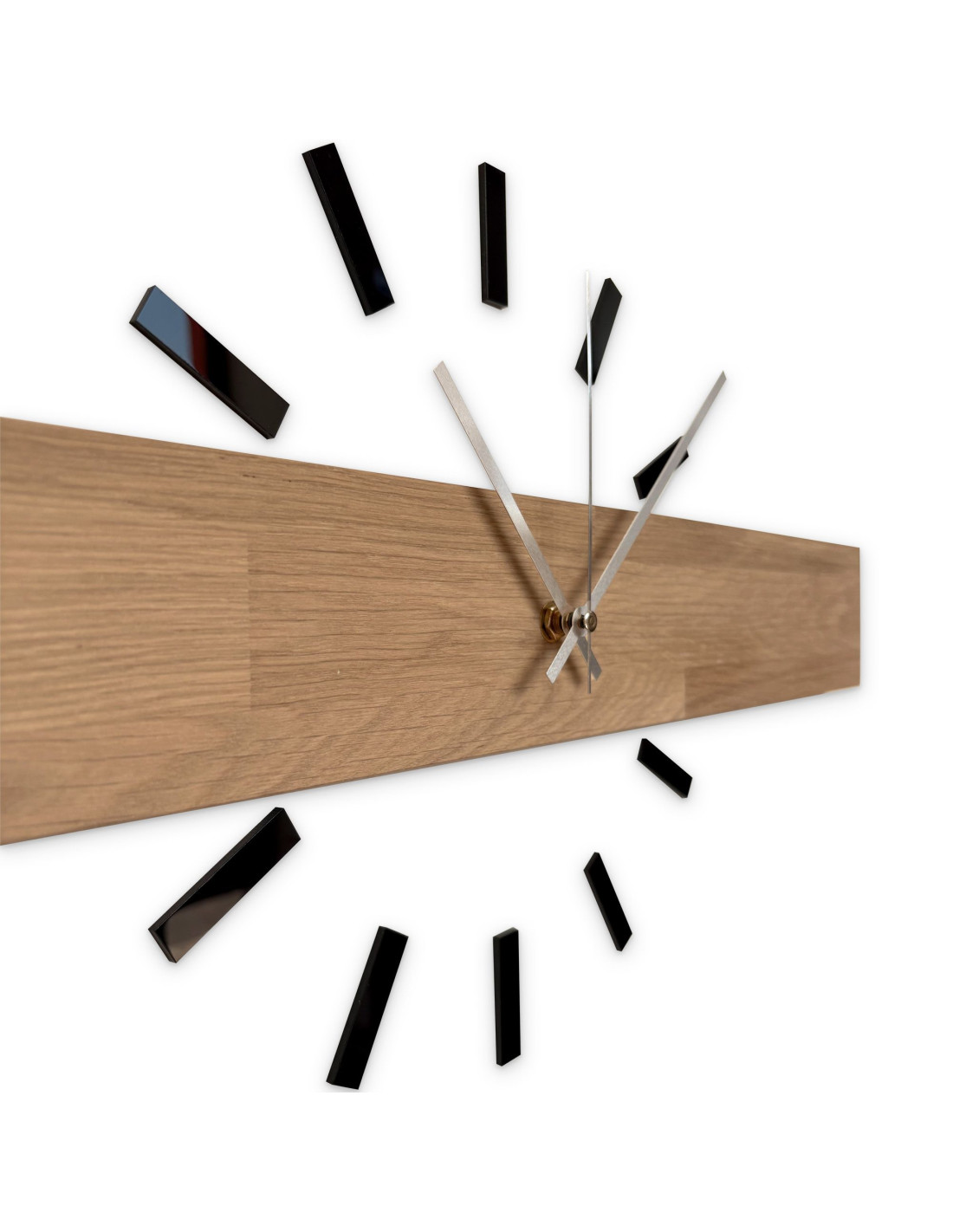 Jede Uhr wird aus massiven Eichenplatten gefertigt, die zunächst mittels CNC-Technik präzise in die gewünschte Form und Größe geschnitten werden .